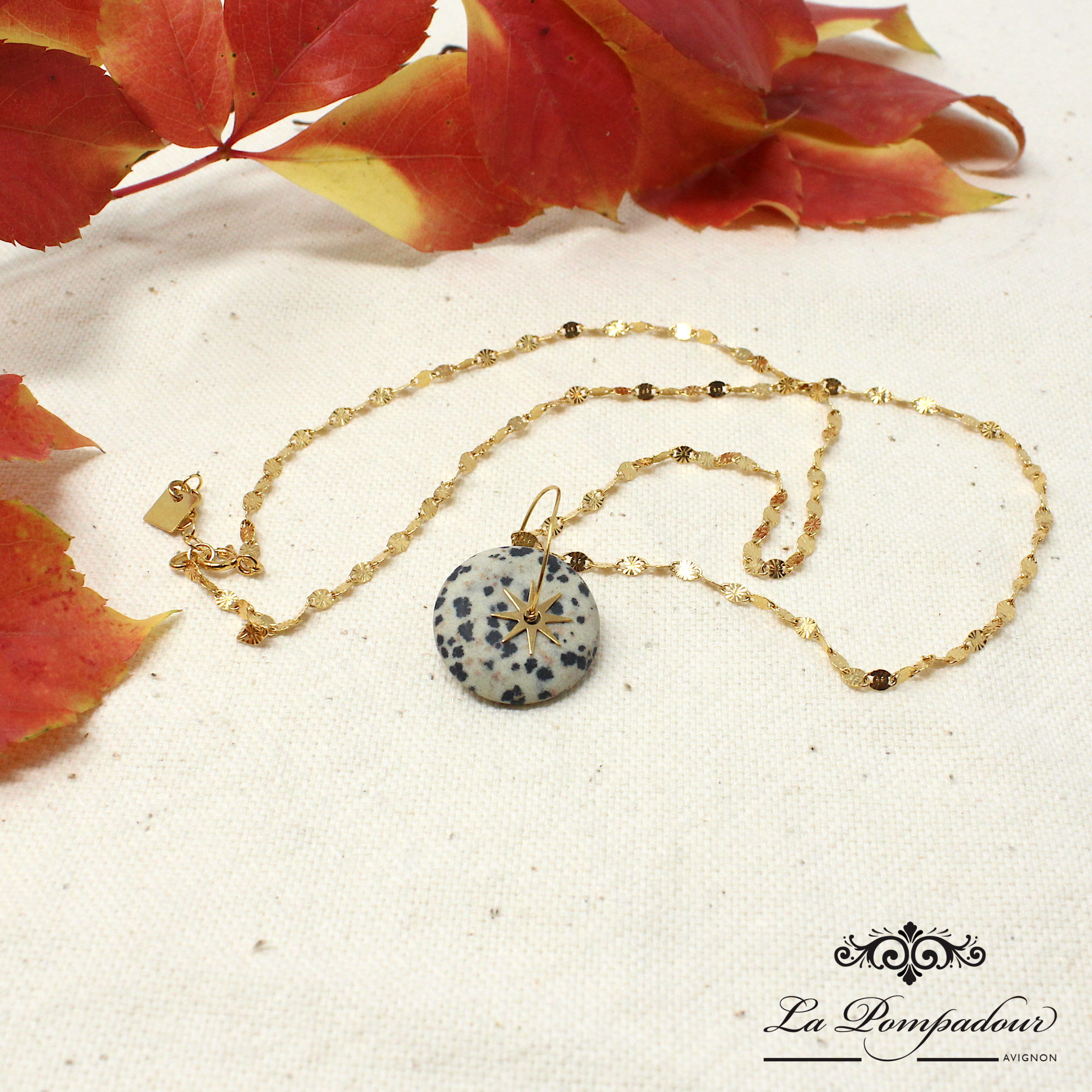 Collier chaine soleils et pendentif en Jaspe Dalmatien. Vermeil
