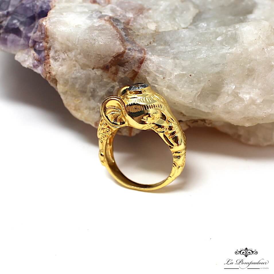 Très jolie bague éléphant toute décorée d'arabesques et motifs et ornée d'une pierre sur le dessus (péridot ou topaze bleue au choix). Une invitation au voyage, on adore.