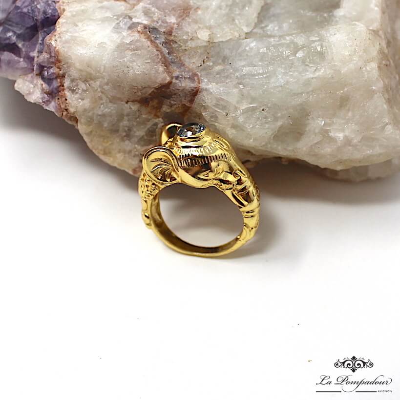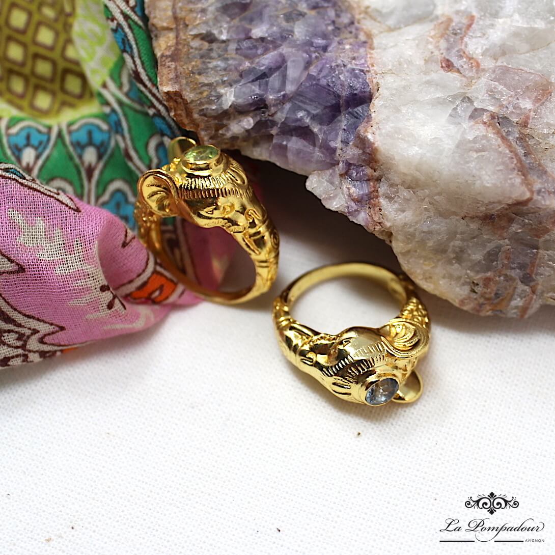 Très jolie bague éléphant toute décorée d’arabesques et motifs et ornée d’une pierre sur le dessus (péridot ou topaze bleue au choix). Une invitation au voyage, on adore.