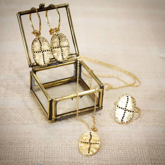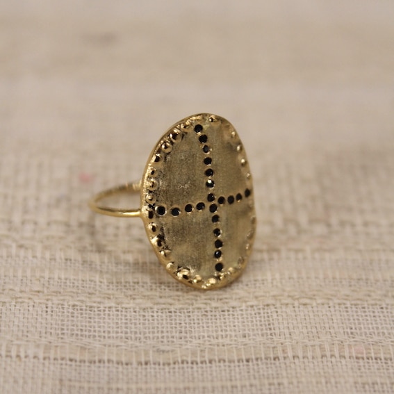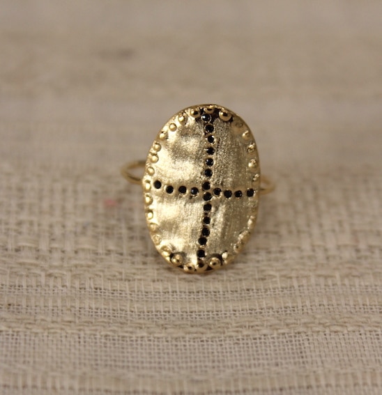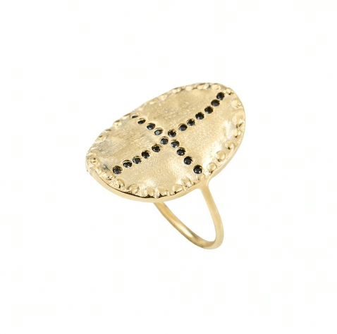 Bague en plaqué or 3 microns brossée matte sertie de zircons noirs en forme de croix irrégulière