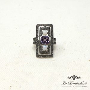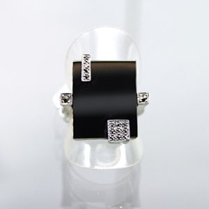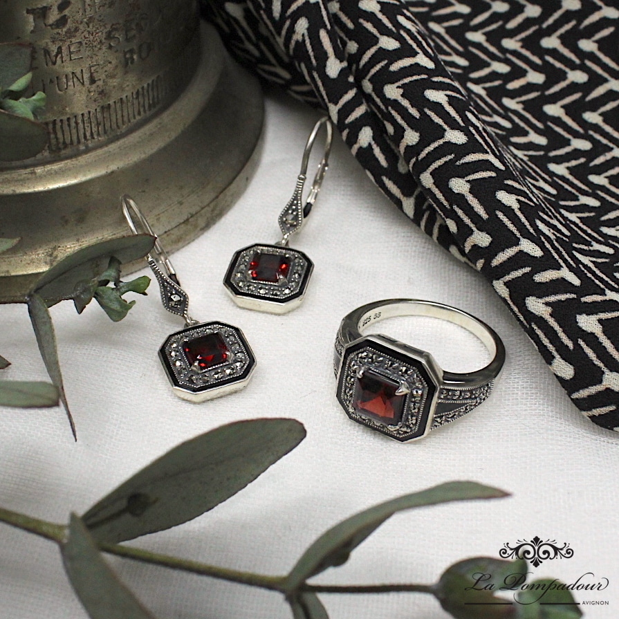 Bague en argent 925 ornée d’un grenats carré, d’émail noir et de petites marcassites.