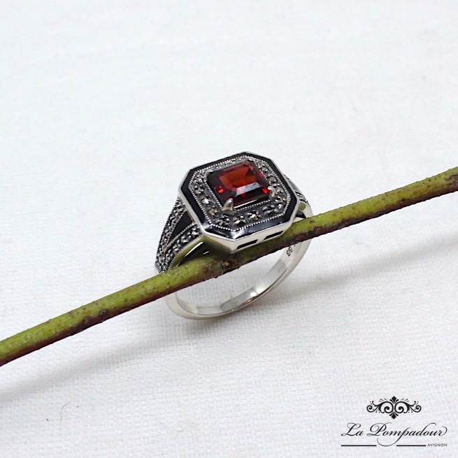 Bague en argent 925 ornée d'un grenats carré, d'émail noir et de petites marcassites.