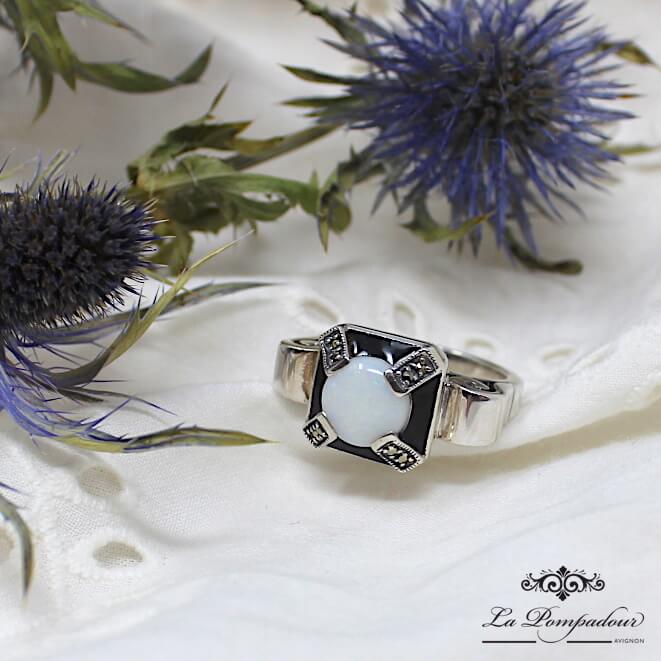 Bague typée Art Déco en argent 925, composée d'une belle opale et d'émail noir, ainsi que de petites marcassites sur les quatre griffes. Deux volutes encadrent l'élément central.
