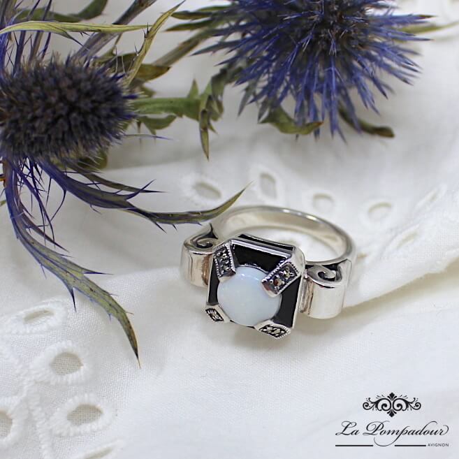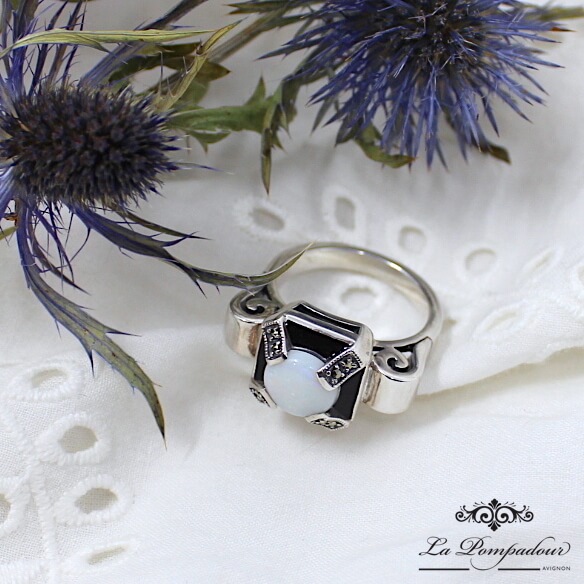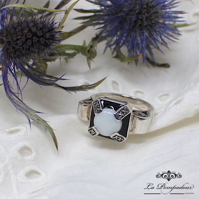 Bague typée Art Déco en argent 925, composée d’une belle opale et d’émail noir, ainsi que de petites marcassites sur les quatre griffes. Deux volutes encadrent l’élément central.