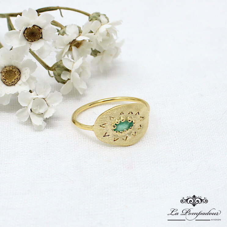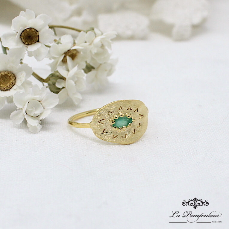 Bague médaille brossée mate, gravée et ornée d’une émeraude goutte serti.