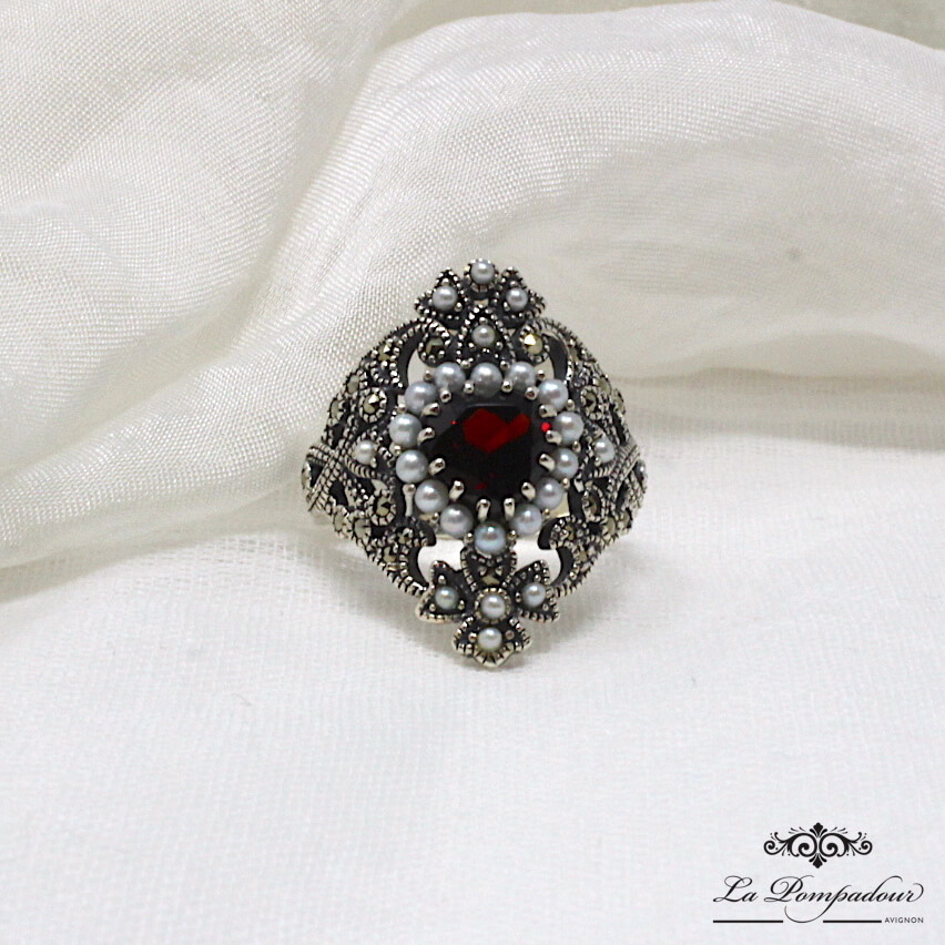 Magnifique bague glamour composée d'un grenat et de perles de culture