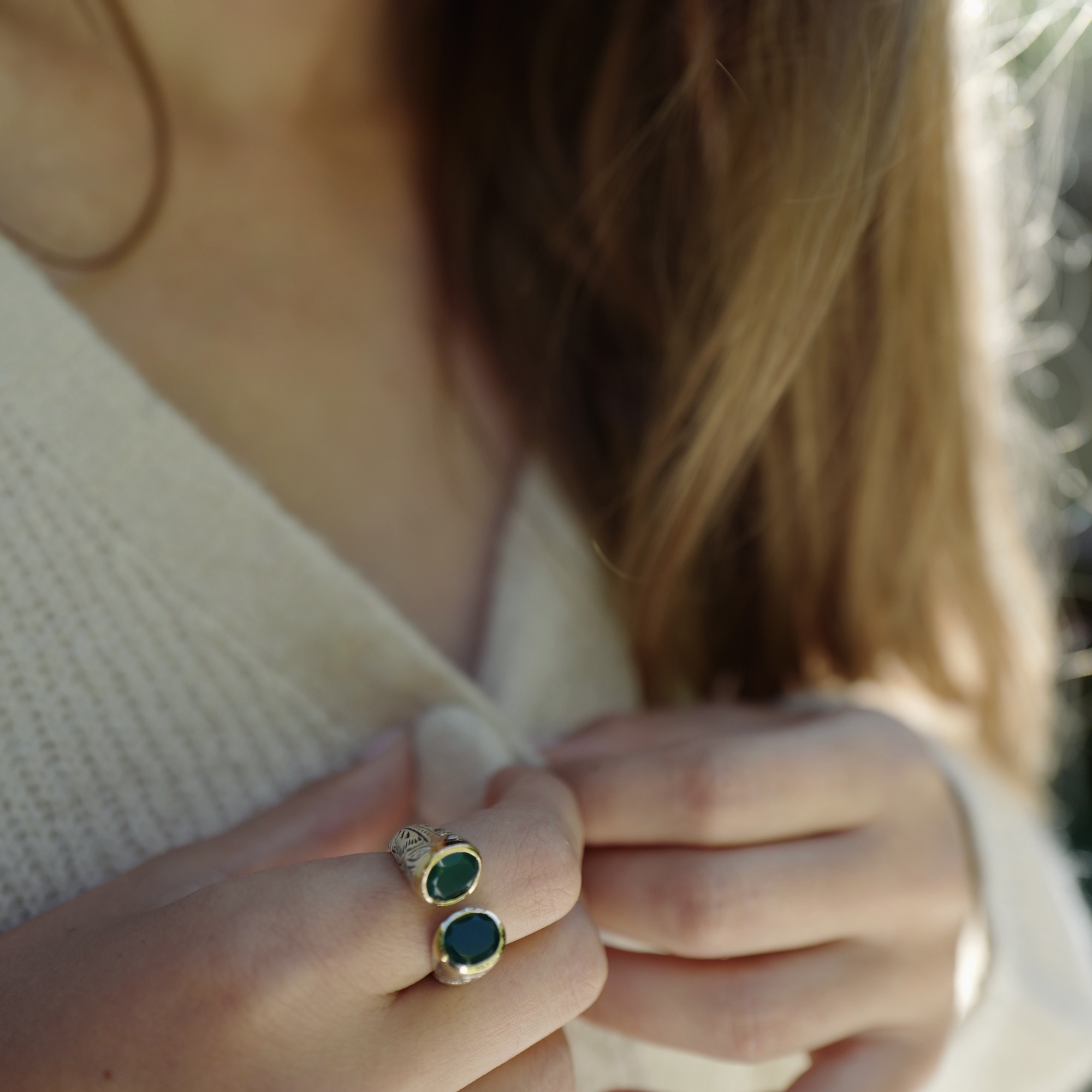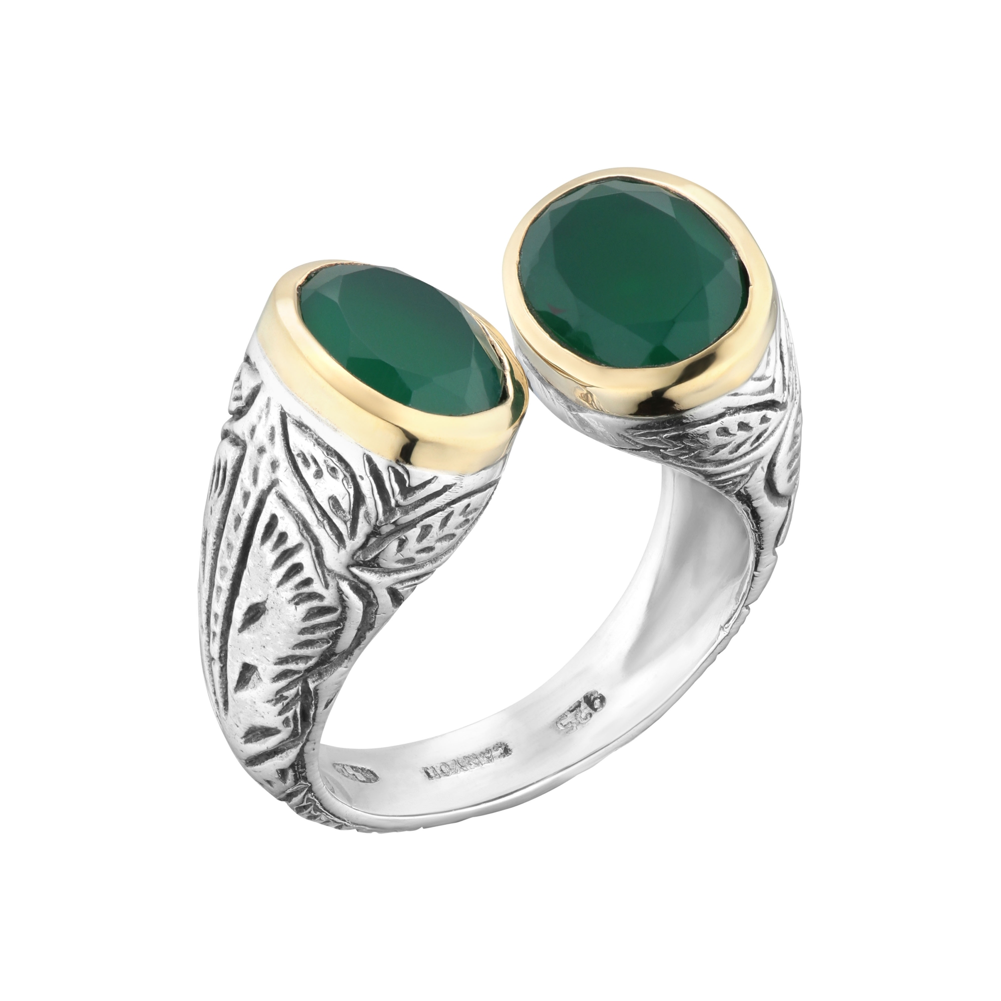 Bague en argent et laiton composée d’un anneau ouvert gravé et de 2 onyx vert sertis de laiton.
