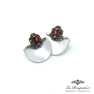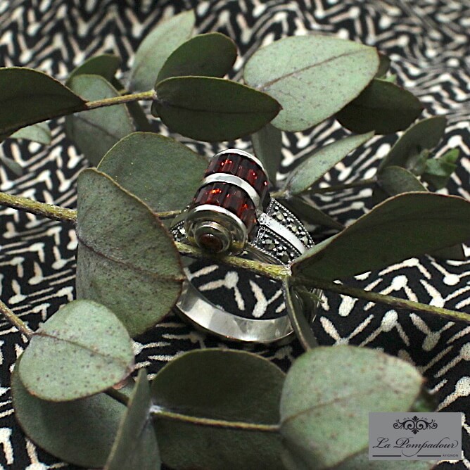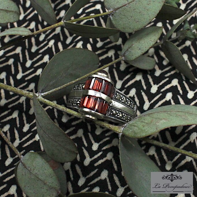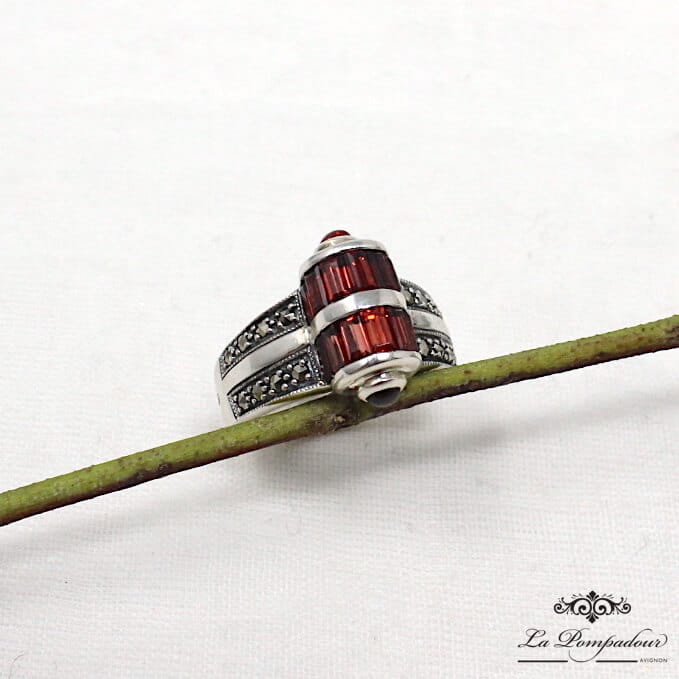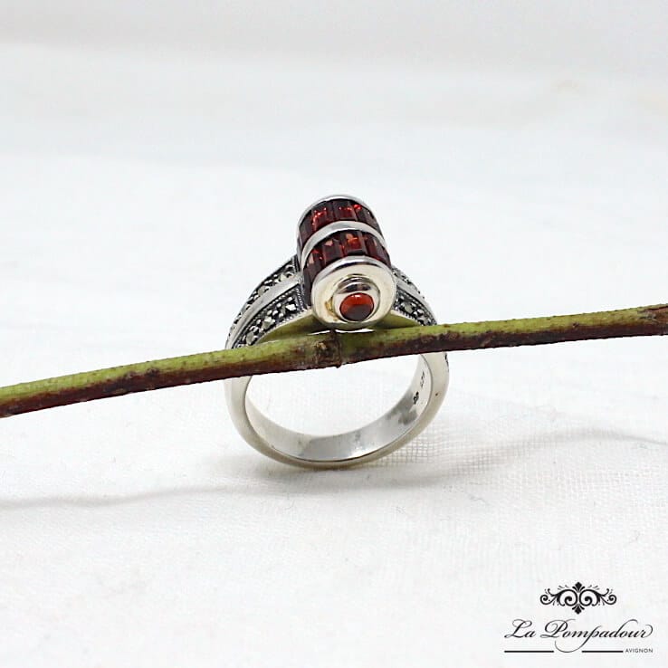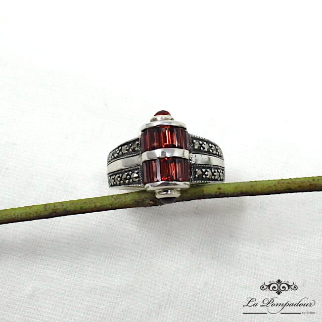 Bague en argent composée de barrettes de grenats et de deux petits grenats ronds sur les côtés, ainsi que de petites marcassites.