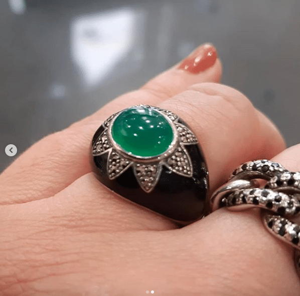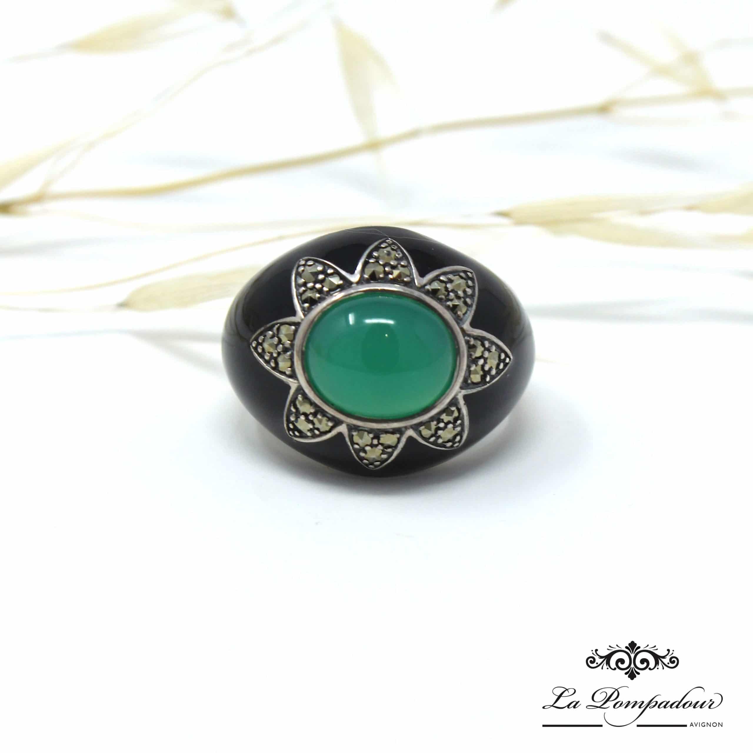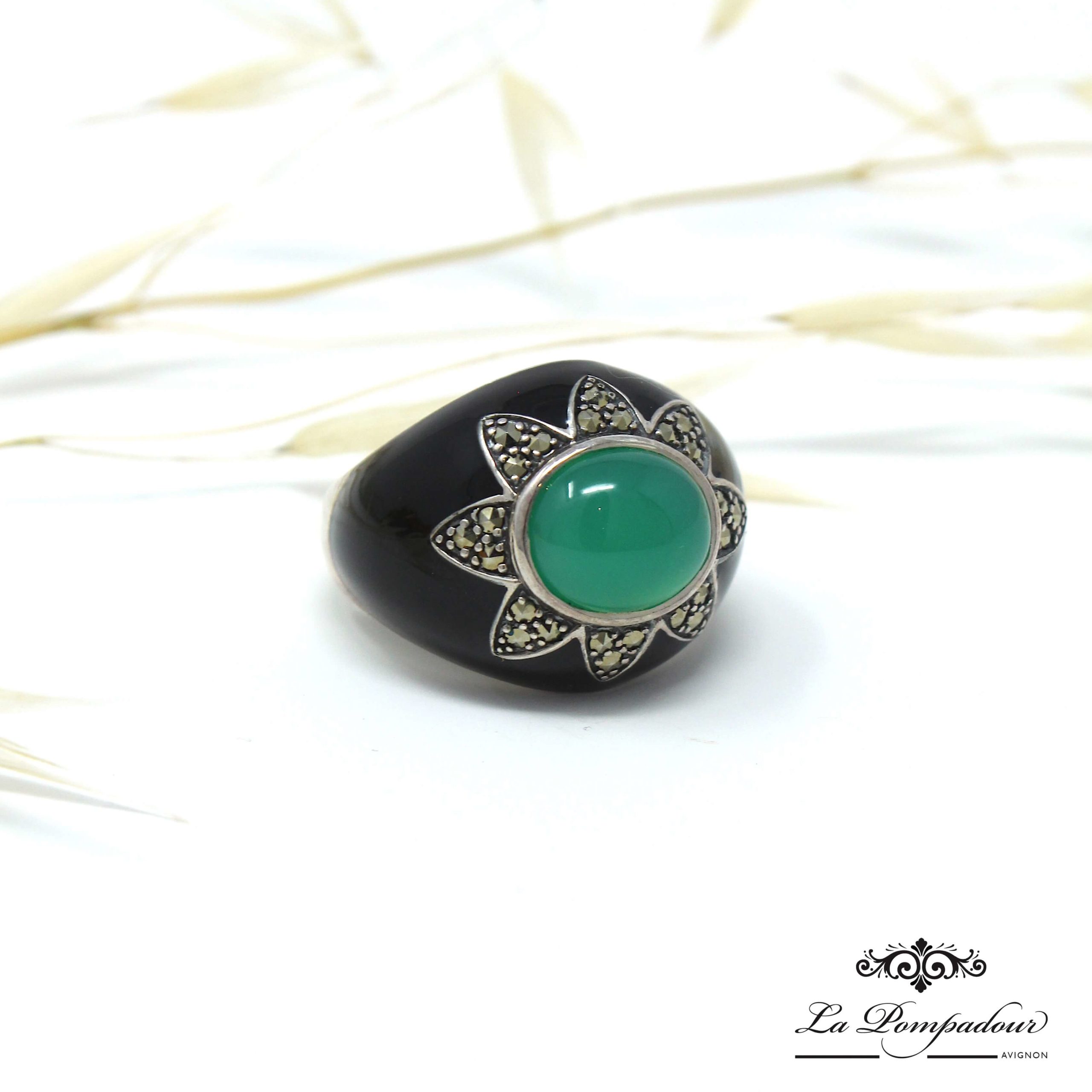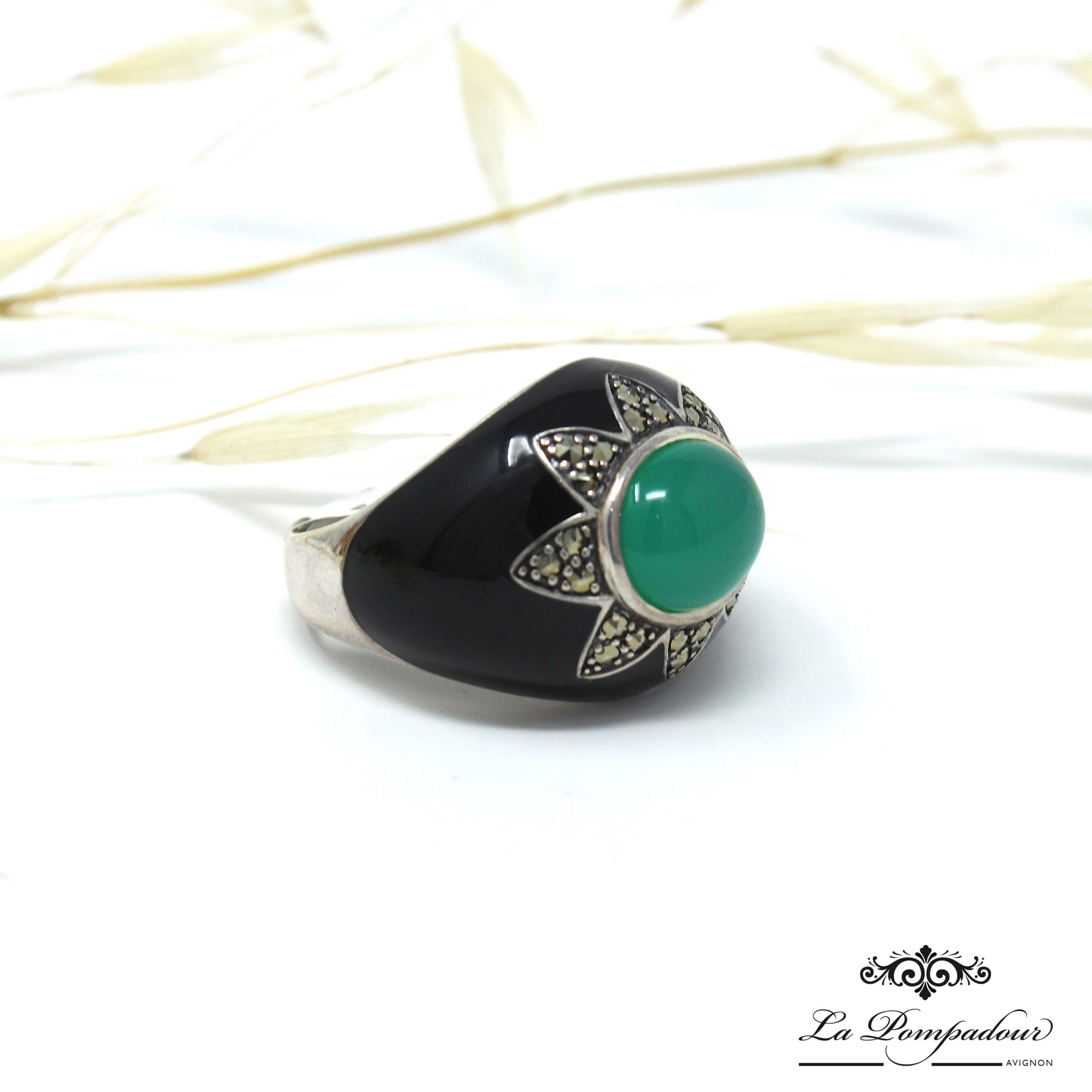 Bague en argent 925, Onyx vert, email noir et marcassites
