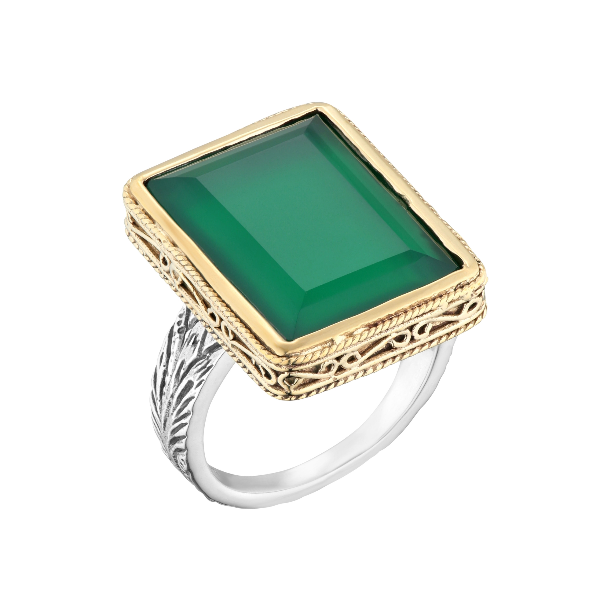 Bague en argent et laiton composée d'un anneau argent gravé et d'un grand onyx vert rectangle sertie de laiton ajouré.