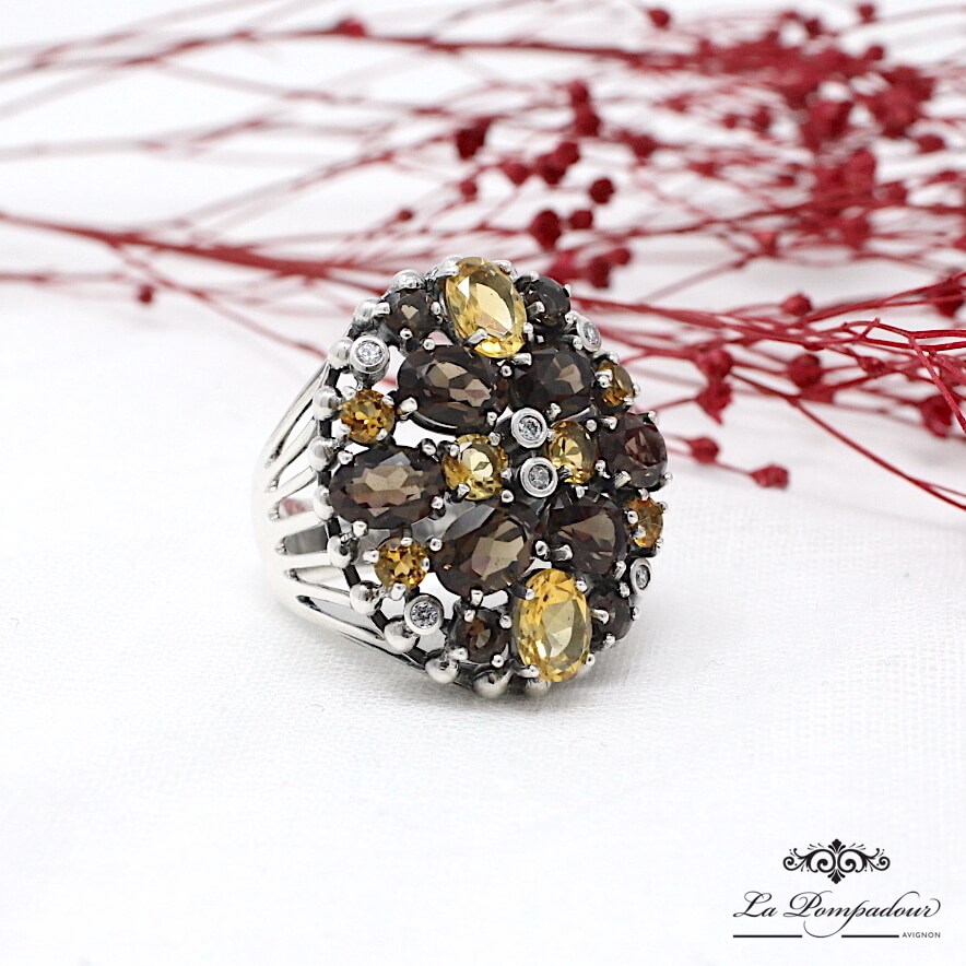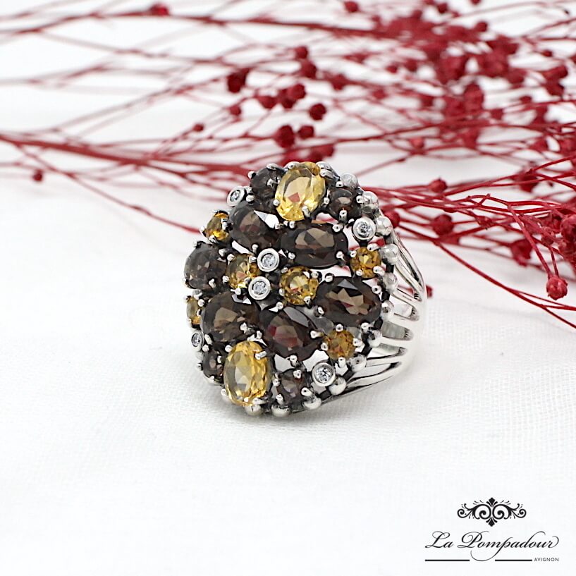 Magnifique bague volumineuse composée de quartz fumé, citrine et oxyde de zirconium