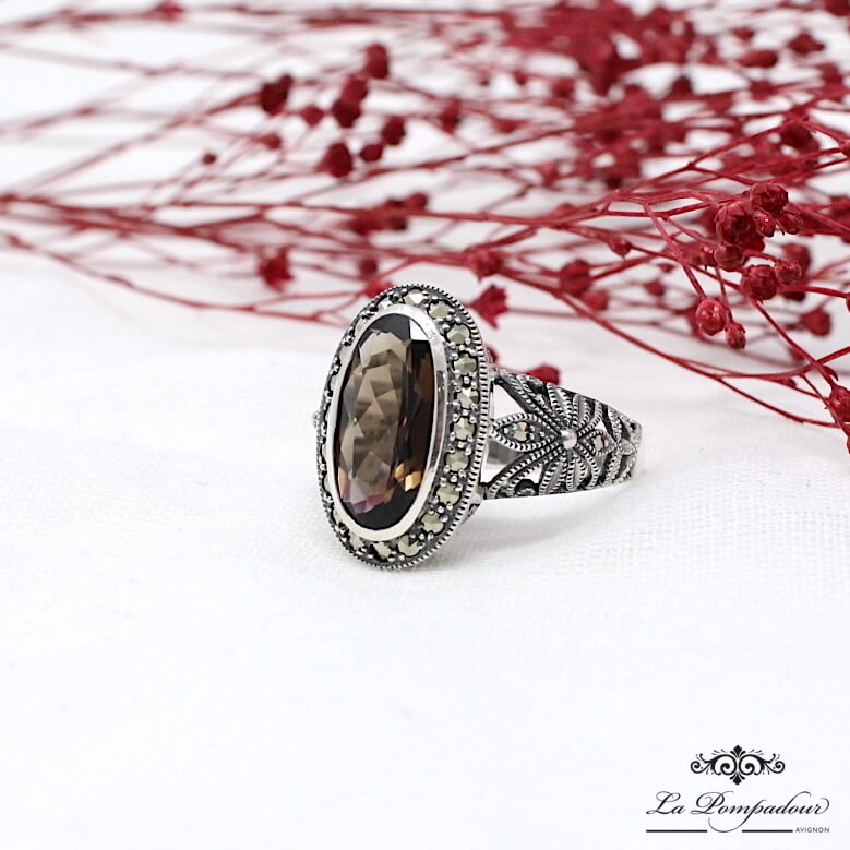 Bague composée d’un beau quartz Fumé ovale facetté sur une délicate monture ajourée de motifs baroques et floraux ornés de petites marcassites.