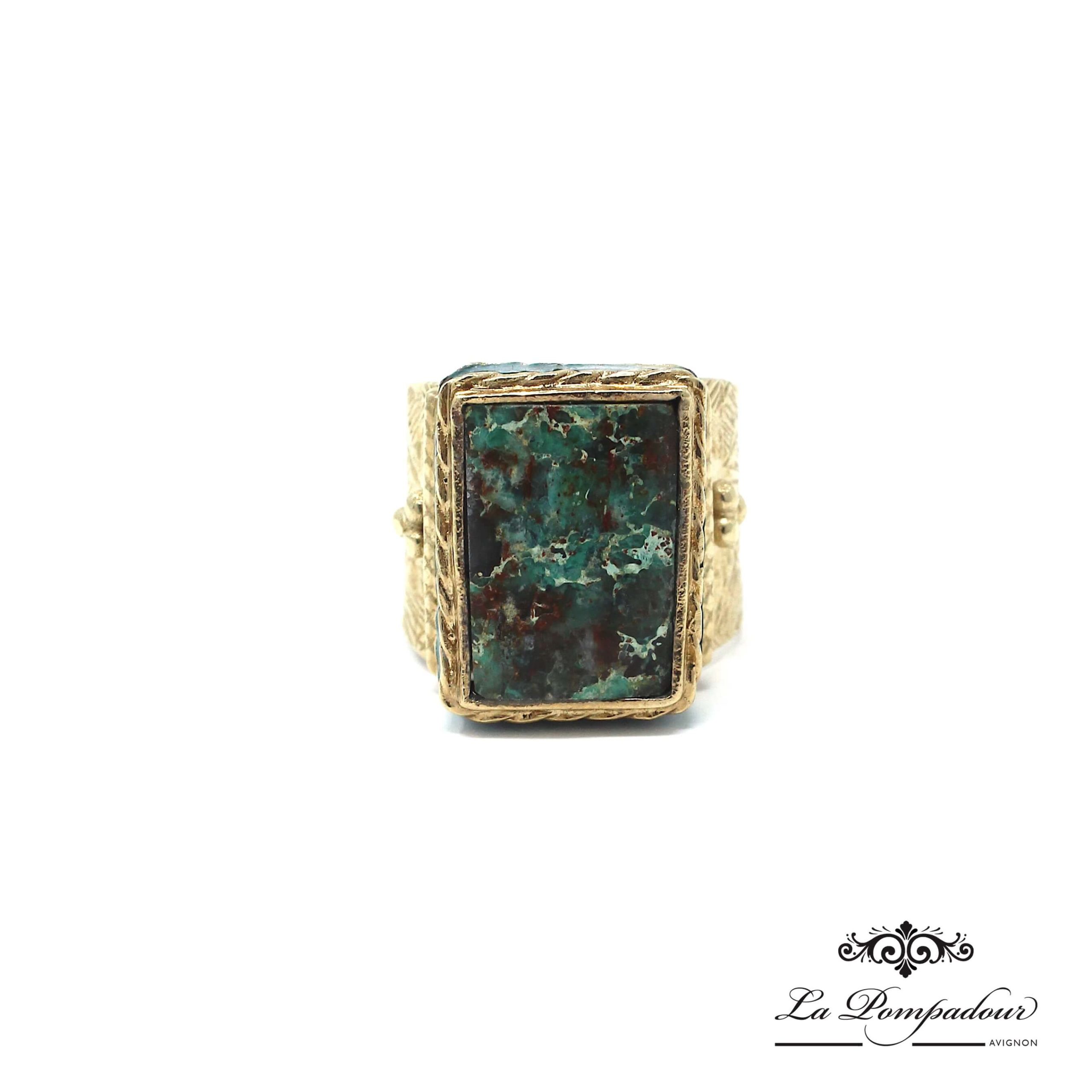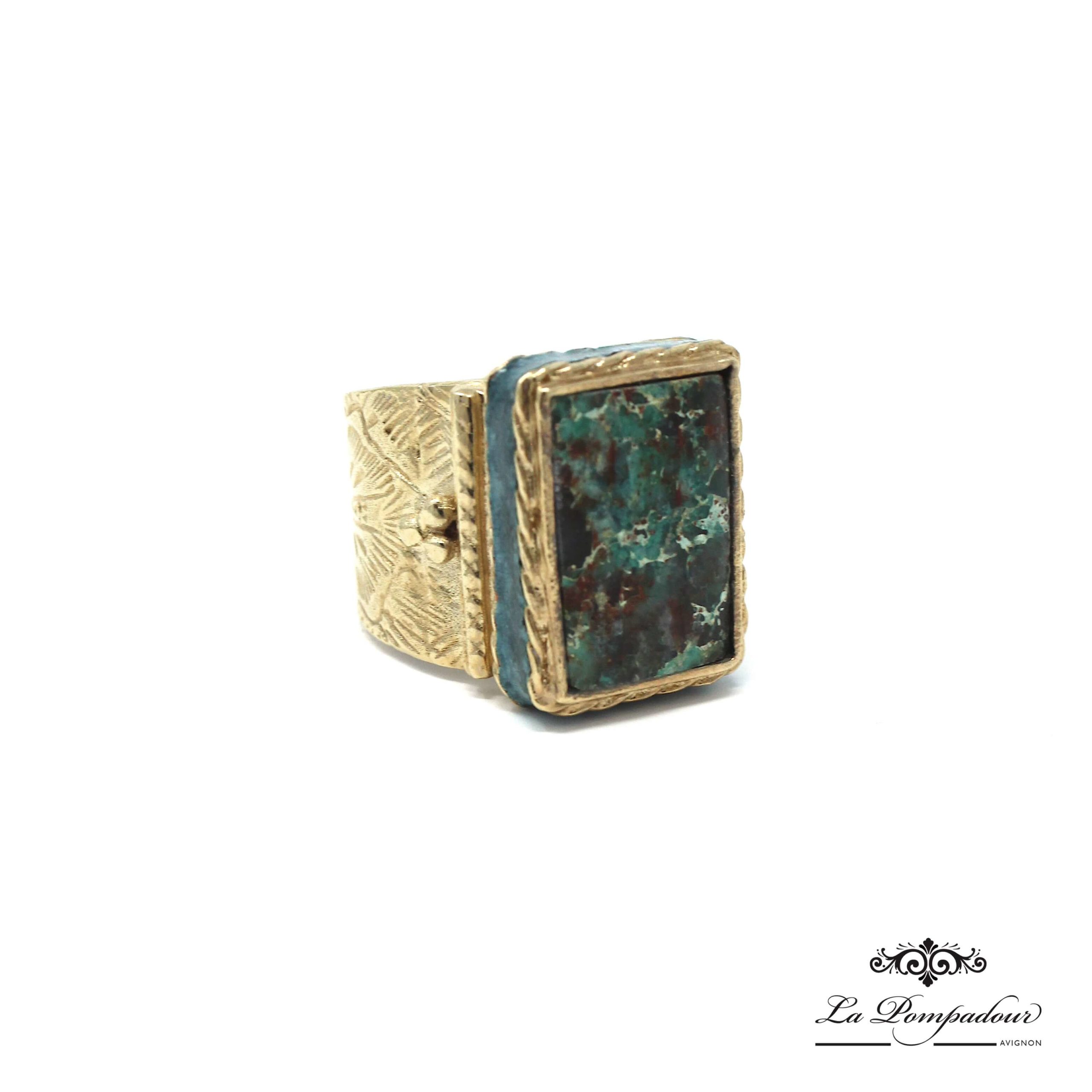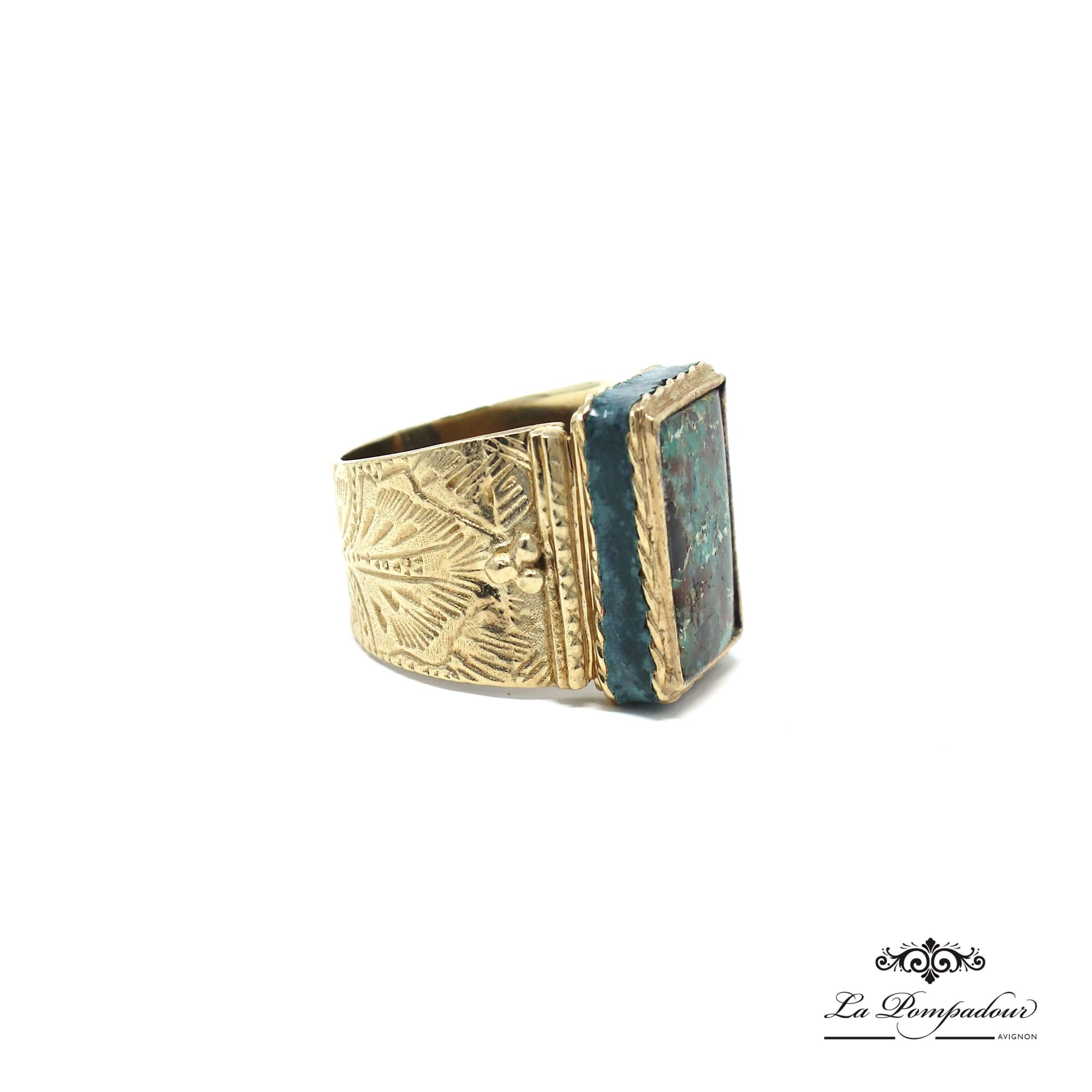 Bague anneau large décoré ciselé, surmonté d’une pierre chrysocolle rectangle sertie.