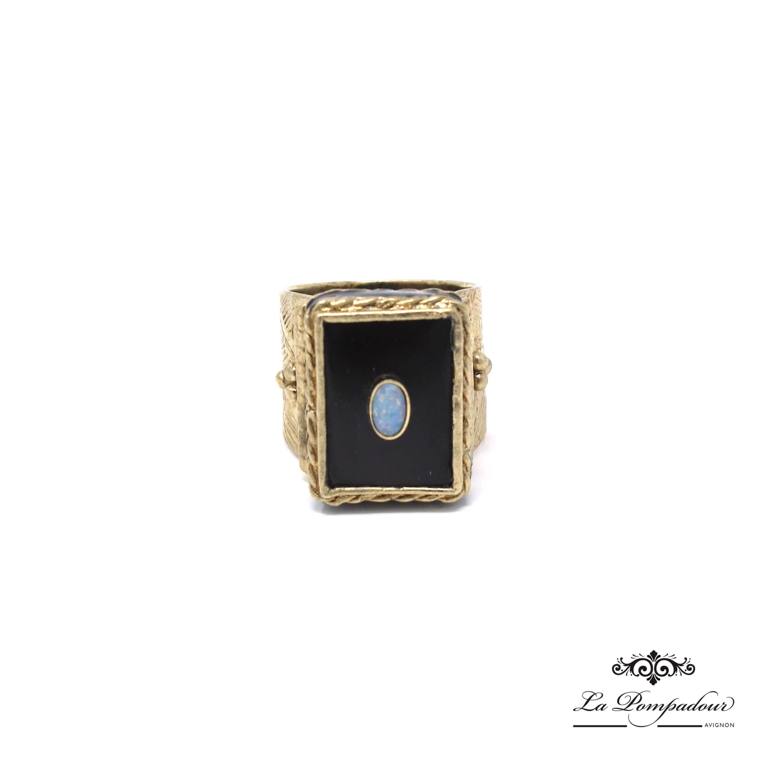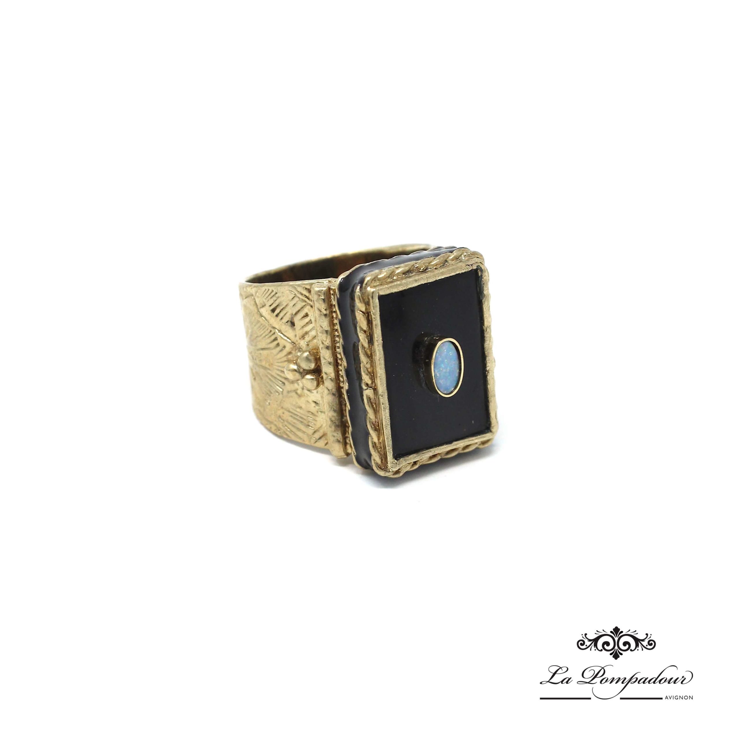 Bague anneau large décoré ciselé, surmonté d’une pierre onyx rectangle et d’une opale irisée.