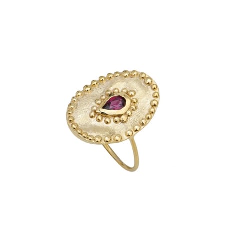 Bague ovale mate, striée et rhodolite en forme de goutte sertie. Plaqué or 3 microns