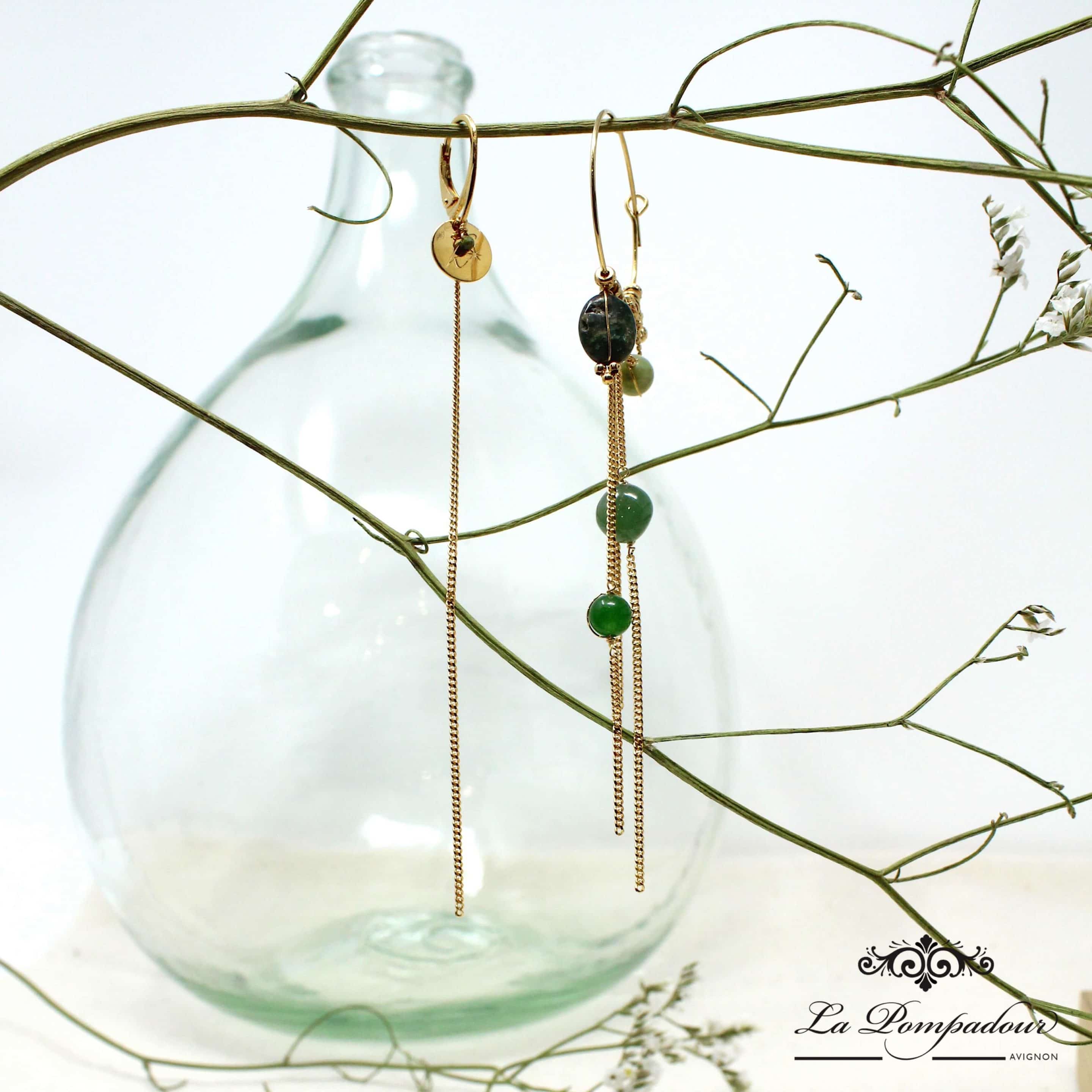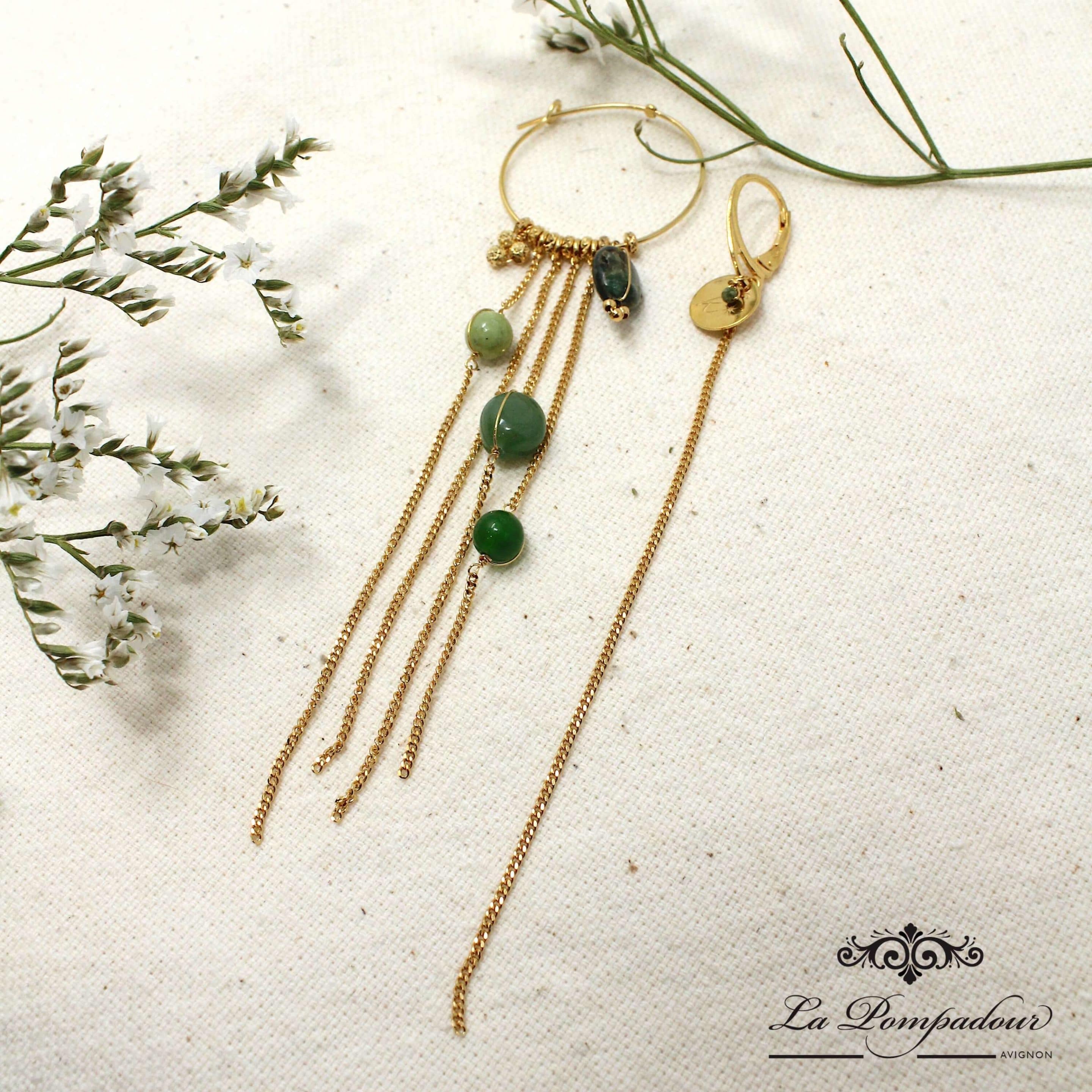Boucles d'oreilles dépareillées, créole multi-chaines, agates et émeraude.