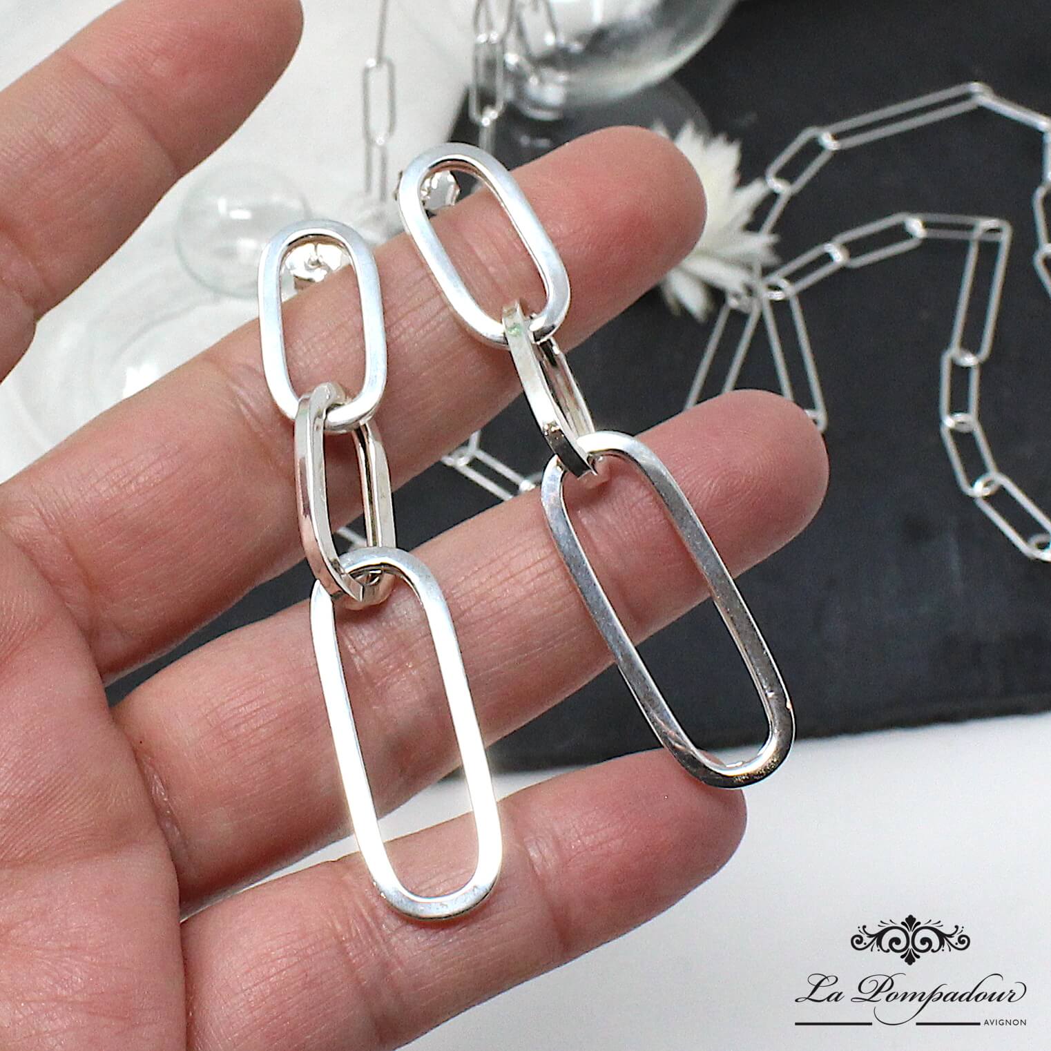 Boucles d’oreilles avec un beau volume qui allient présence et élégance de la maille trombone.