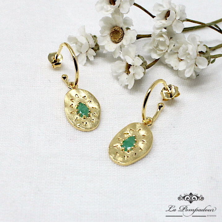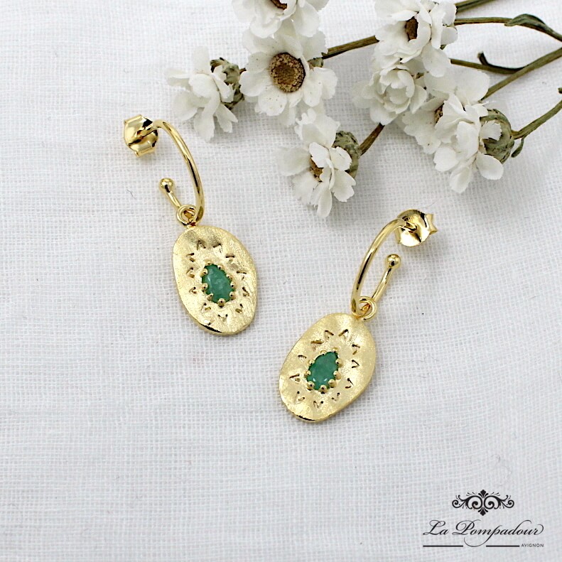 Créoles médailles brossées mates, gravées et ornées d'émeraudes gouttes sertis.