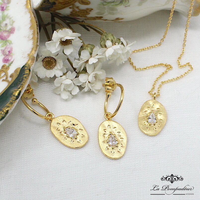 Créoles médailles brossées mates, gravées et ornées de zircons gouttes sertis.