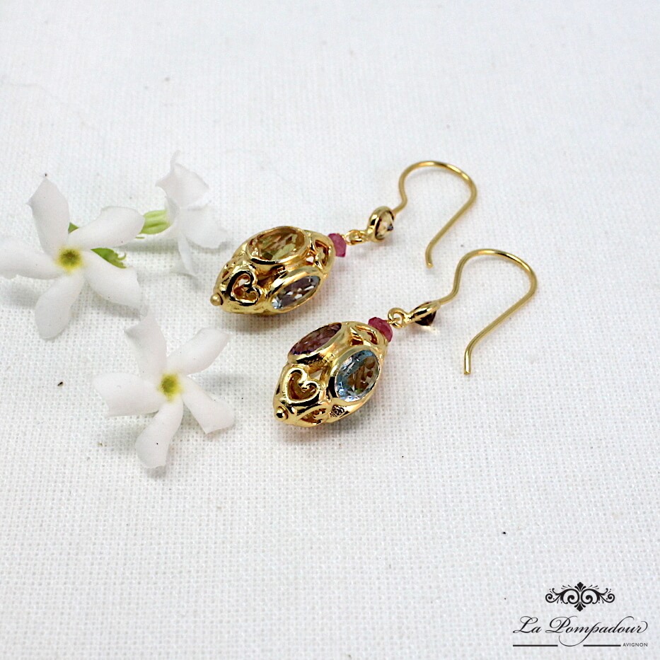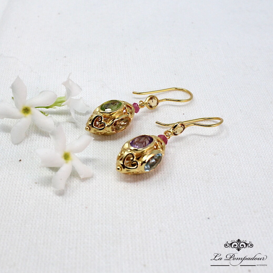 Boucles d'oreilles multi-pierres (améthyste, péridot, topaze bleue et citrine)