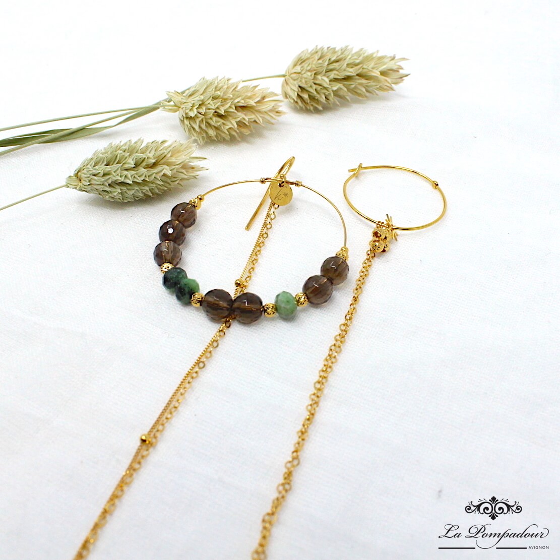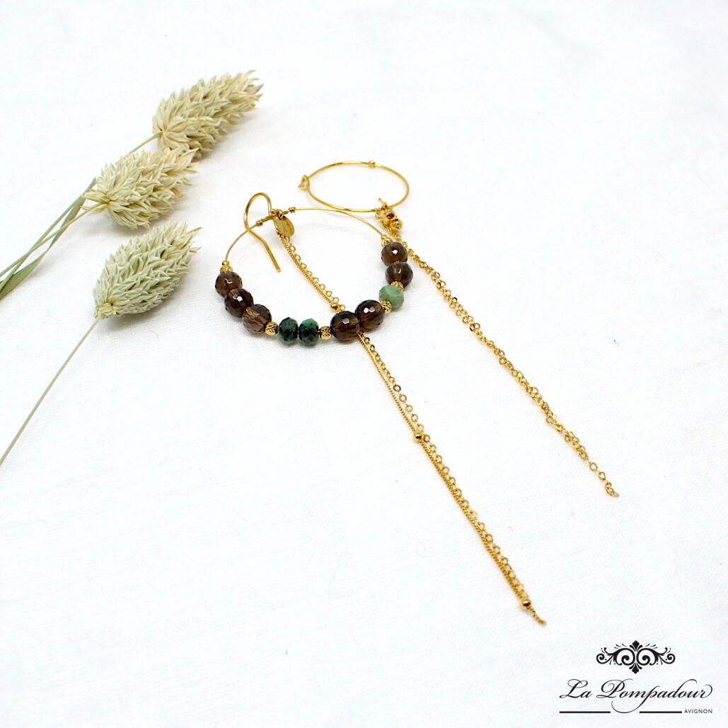 Boucles d’oreilles dépareillées en vermeil (argent plaqué or 5 microns) composées de quartz fumé,et rubizoisite