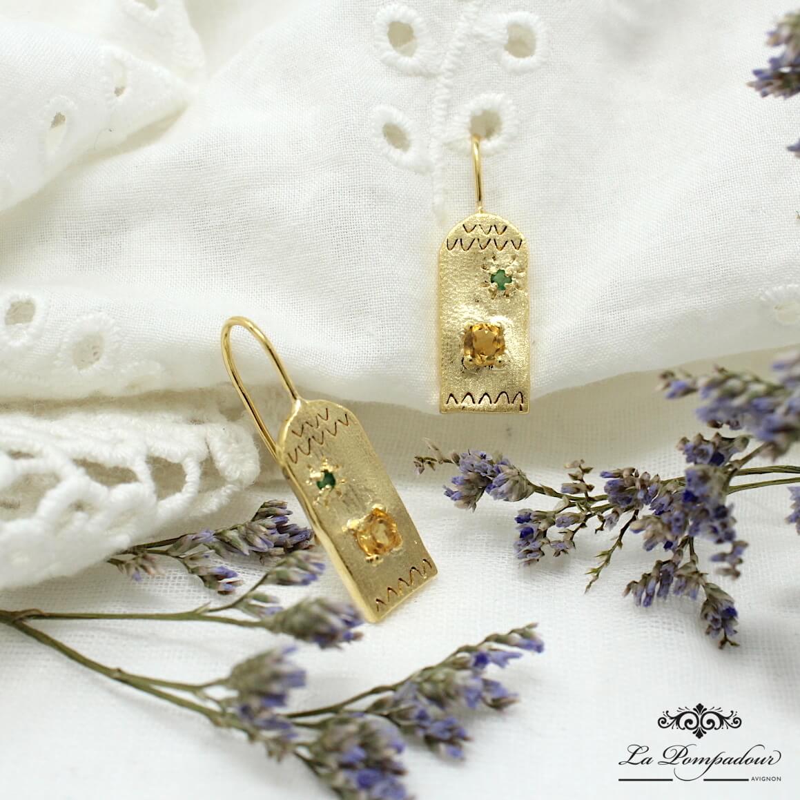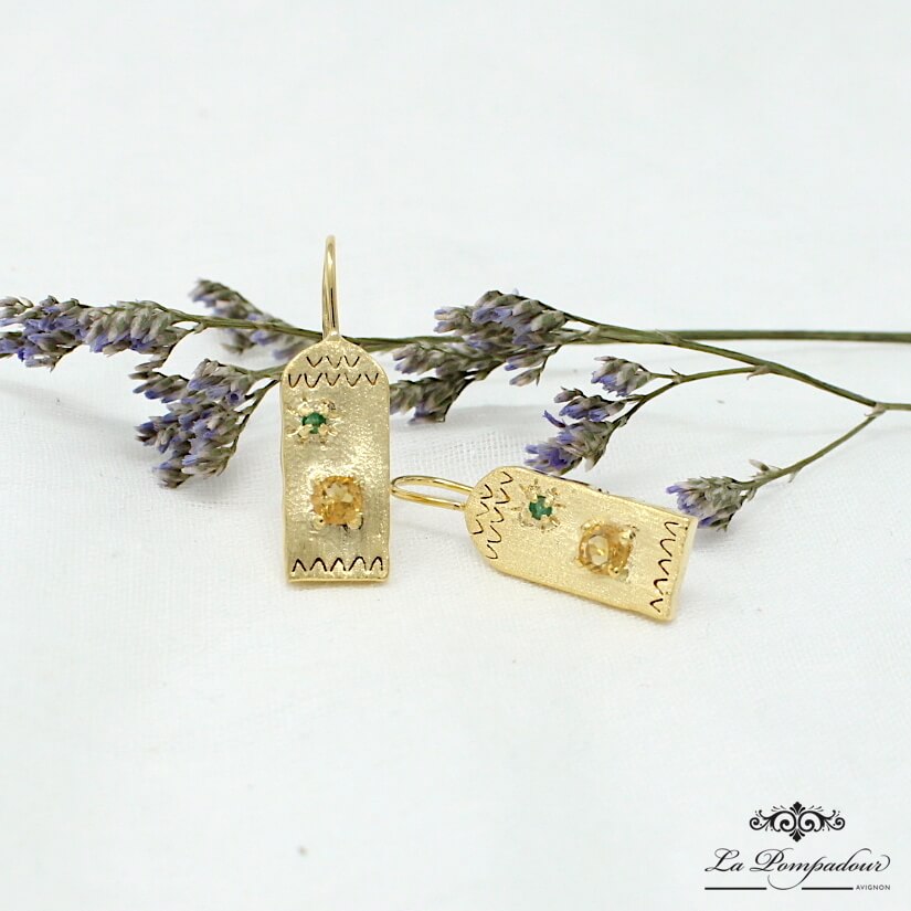 Boucles d’oreilles mattes, brossées composées d’une citrine et d’une émeraude serties.