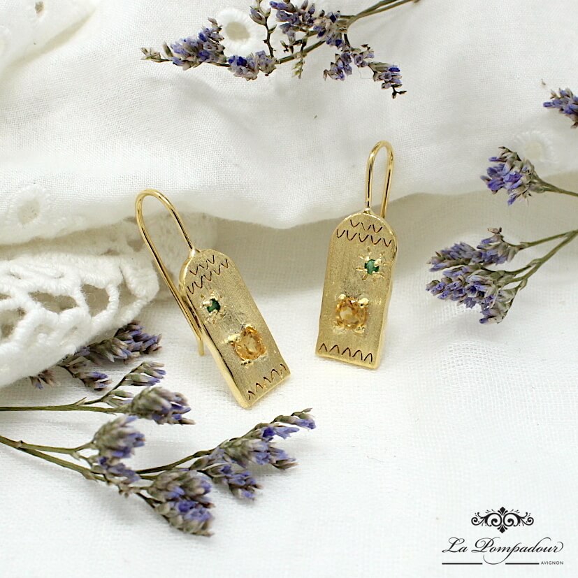 Boucles d'oreilles mattes, brossées composées d'une citrine et d'une émeraude serties.