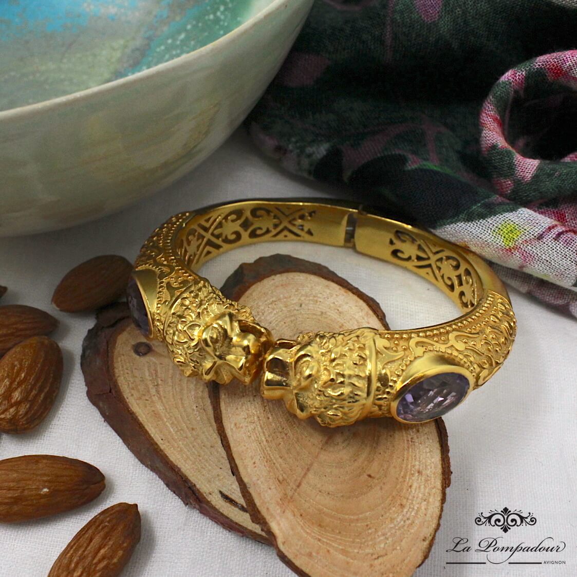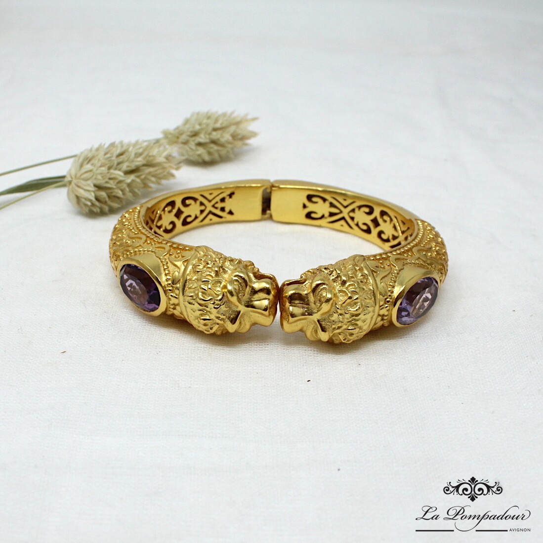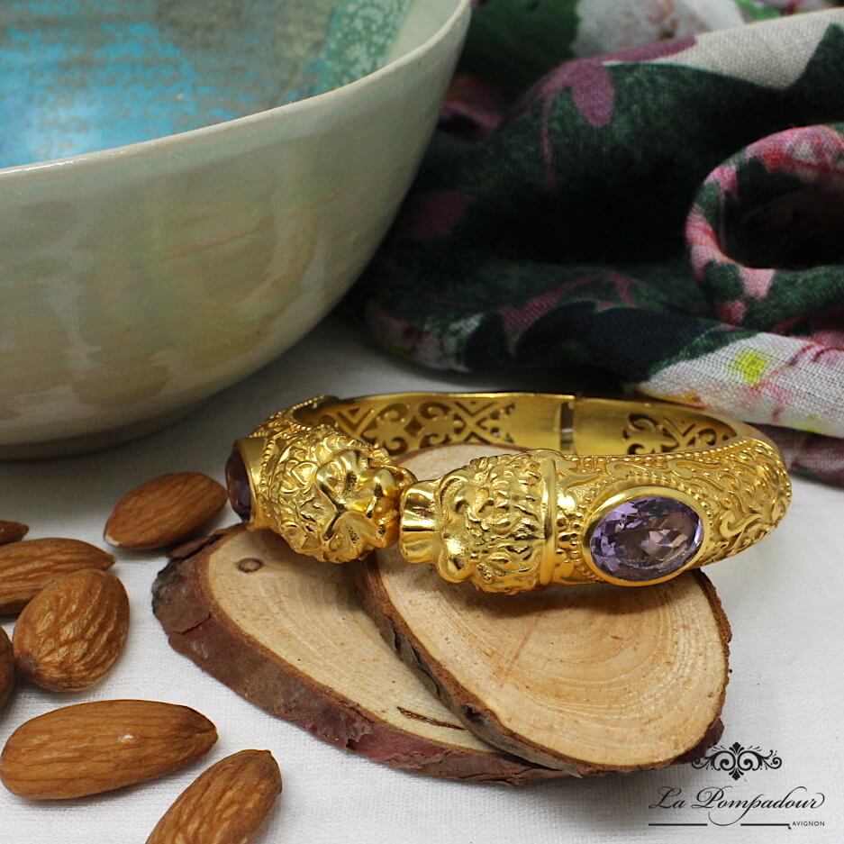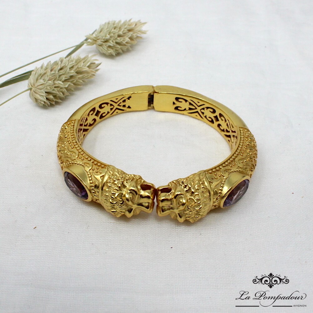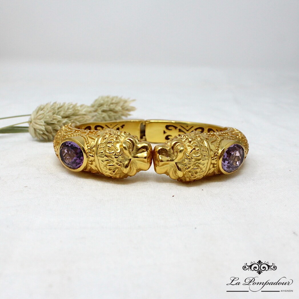 Superbe bracelet orné de têtes de lions et composé de deux belles améthystes à facettes. On aime les détails et la finesse des têtes de lion ainsi que des motifs arabesque qui lui donnent son look baroque. Coup de coeur pour ce magnifique bracelet