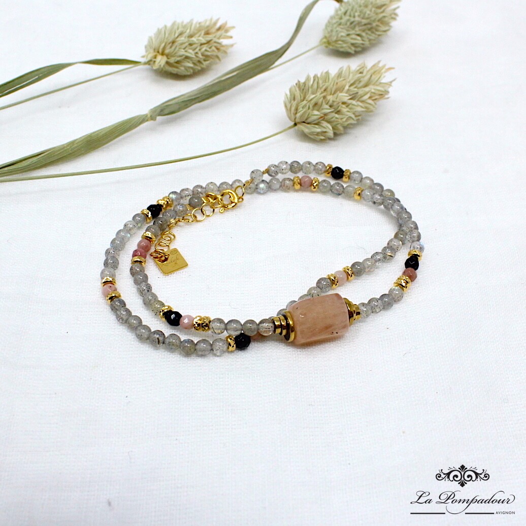 Bracelet double tours composé de perles de pierres de 3mm en labradorite, oeil de faucon et rhodonite, pierre centrale rhodonite, éléments en vermeil