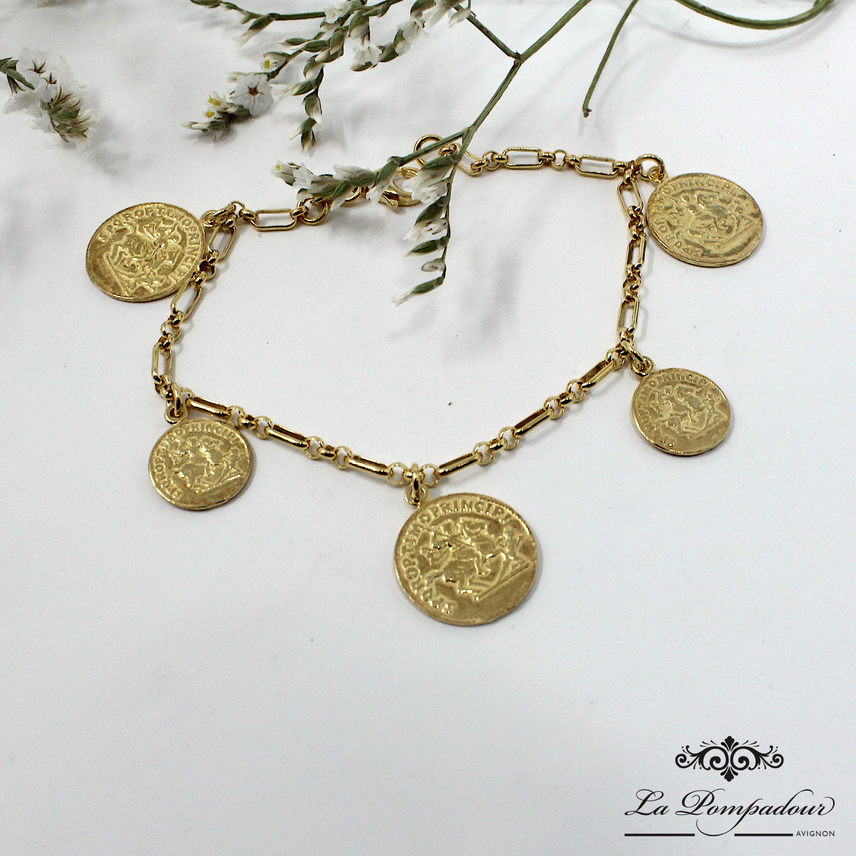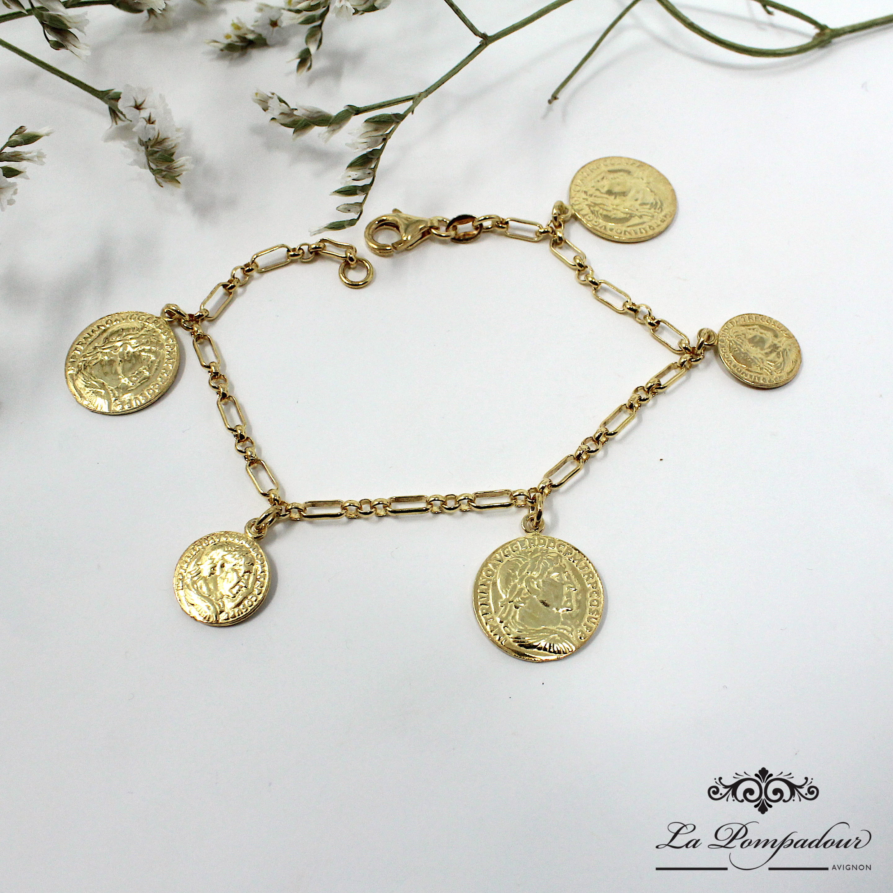 Bracelet composés de médailles romaines réversibles de différentes tailles.
