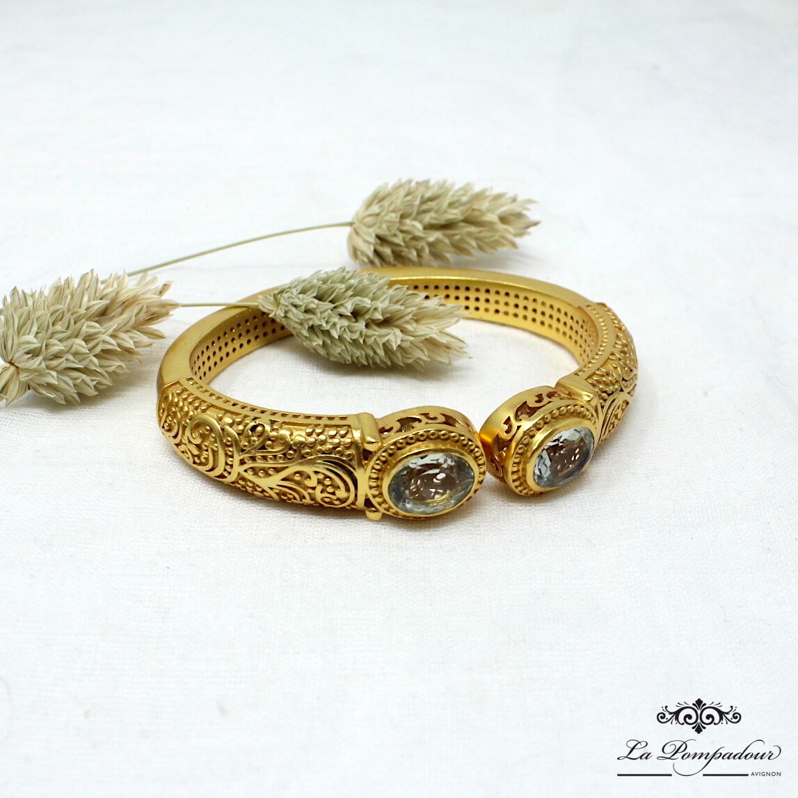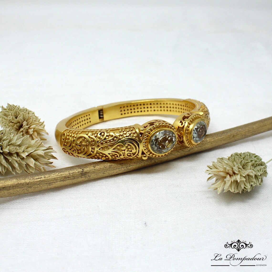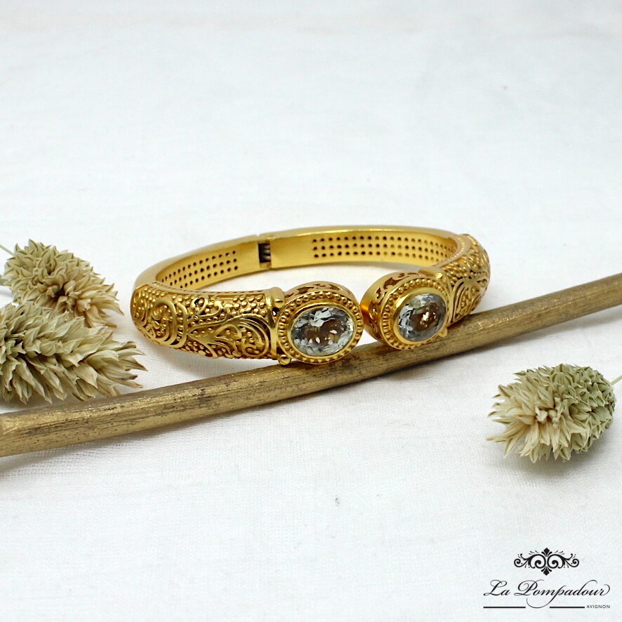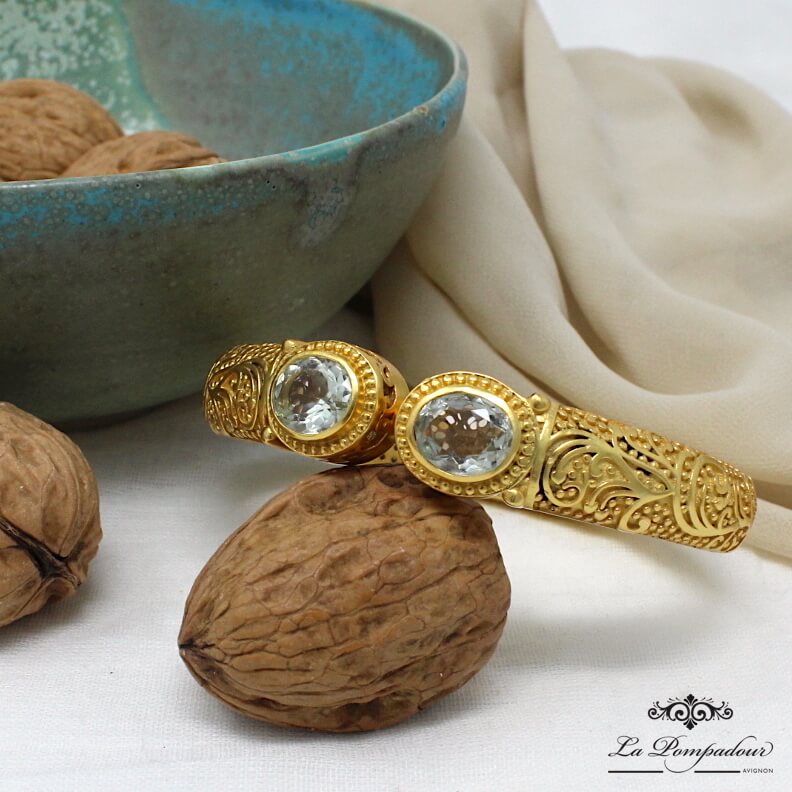 Superbe bracelet composé de deux belles améthystes vertes et orné de motifs arabesque. L’améthyste verte est une pierre d’une couleur très tendre et clair qui apporte beaucoup de lumière au bracelet, les détails et la finesse des motifs arabesque lui donnent son look baroque. Coup de coeur pour ce magnifique bracelet