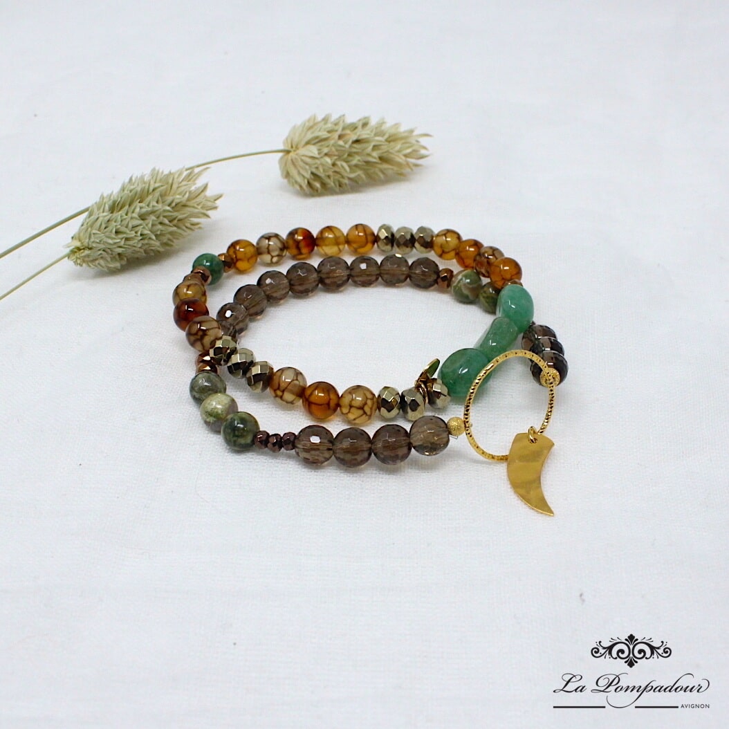 Bracelets Duo composé de perles de pierre de 6 mm de quartz fumé, d’agate feu, bonzite et jade. Eléments en vermeil (argent plaqué or 5 microns)