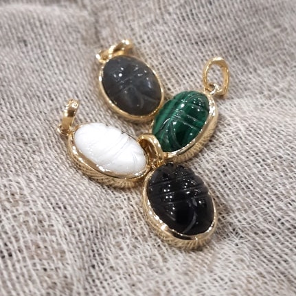 Pendentif charms Scarabée serti de laiton avec une bélière ouvrante qui permet de l’accrocher aisément à tout type de chaine ou support.