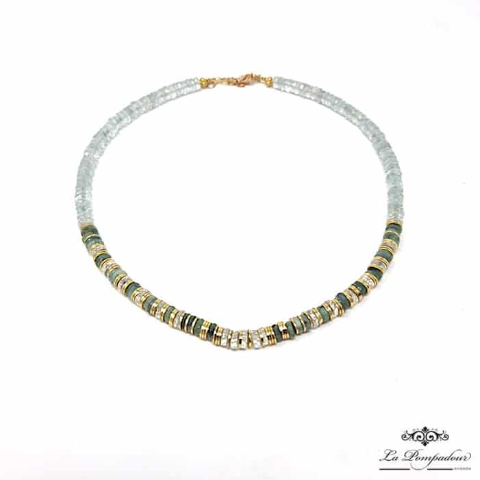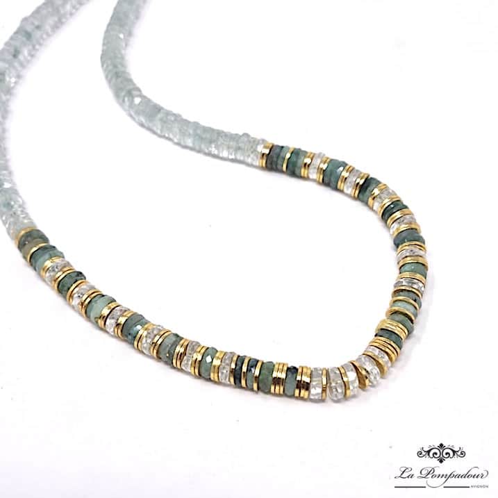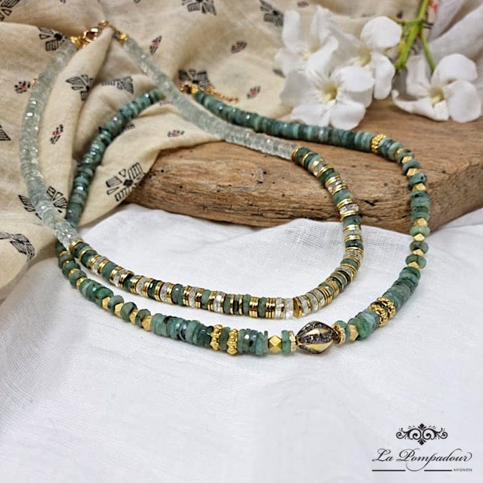 Il est composé d’améthystes vertes facettées et d’émeraudes facettées.