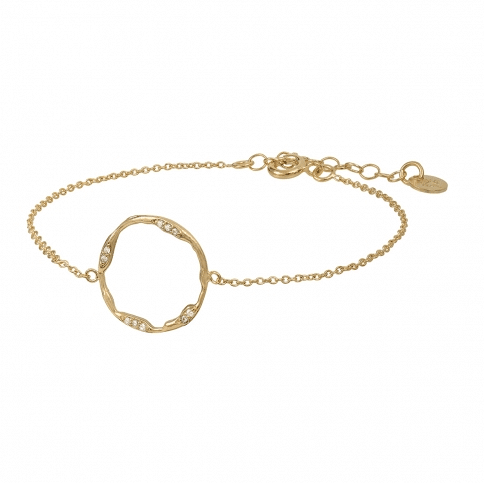 Bracelet avec un rond central irrégulier, ajouré et zircons blancs sertis. Chainette permettant d'ajuster la longueur