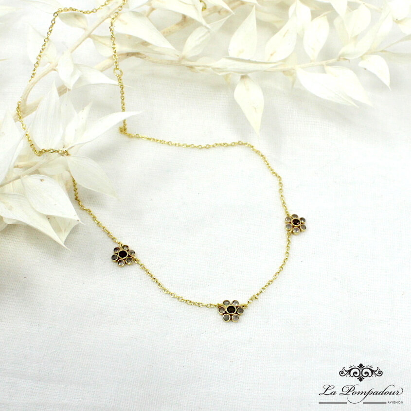 Collier composé de trois petites fleurs au coeur en quartz fumé et pétales en labradorite clair.