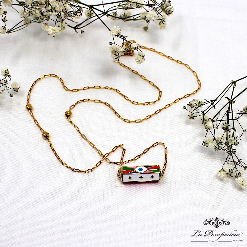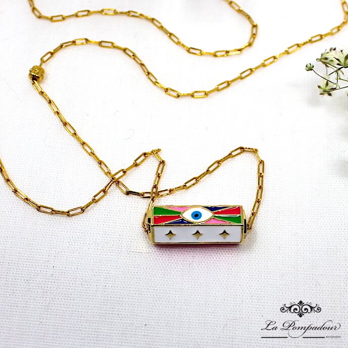 Collier avec amulette émaillée multi couleurs, oeil de protection sur chaîne
