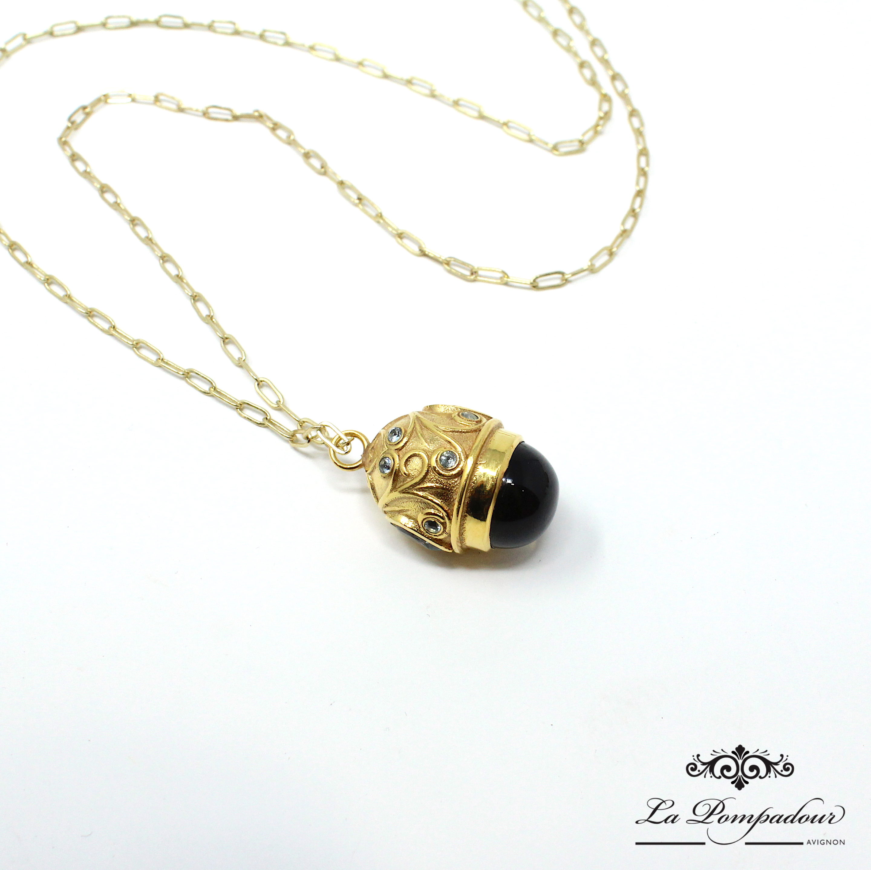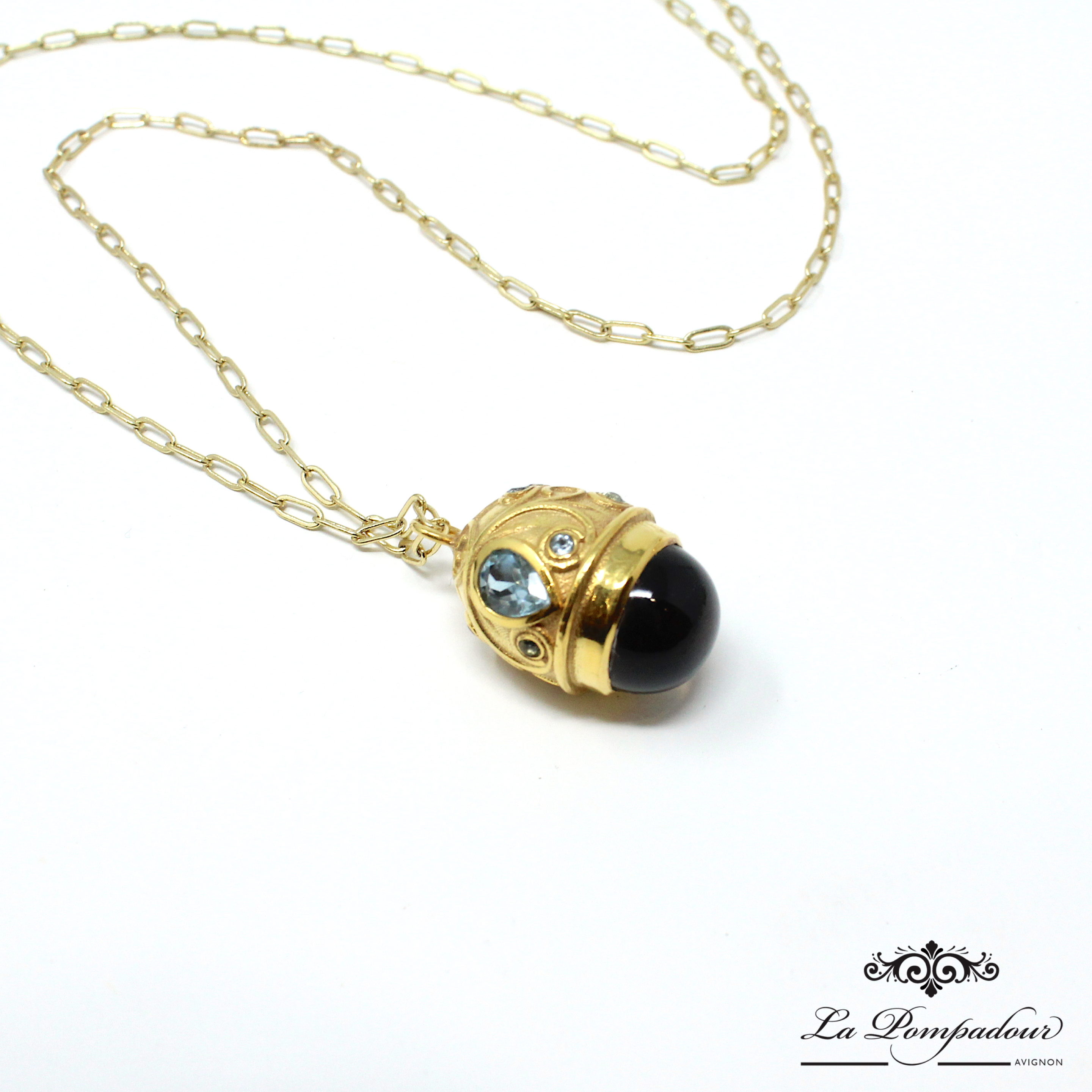 Magnifique sautoir avec un très beau pendentif composé d’un gros Quartz Fumé et orné de Topazes bleues. On adore également ses motifs baroques.