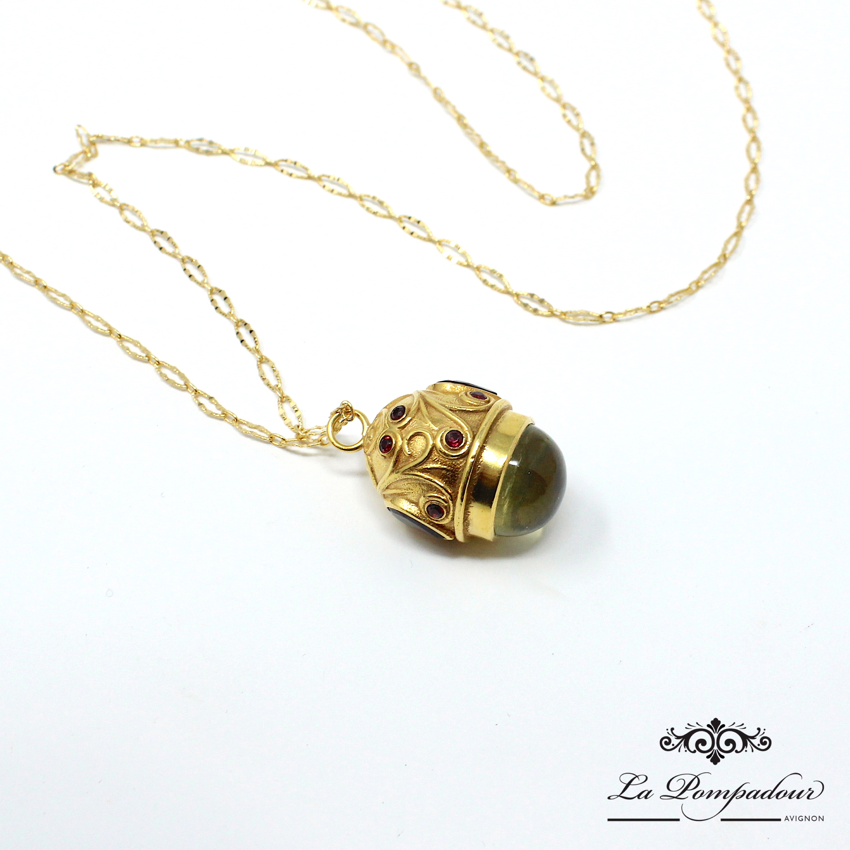 Magnifique sautoir avec un très beau pendentif composé d'un gros Quartz Lemon et orné de Grenats. On adore également ses motifs baroques.