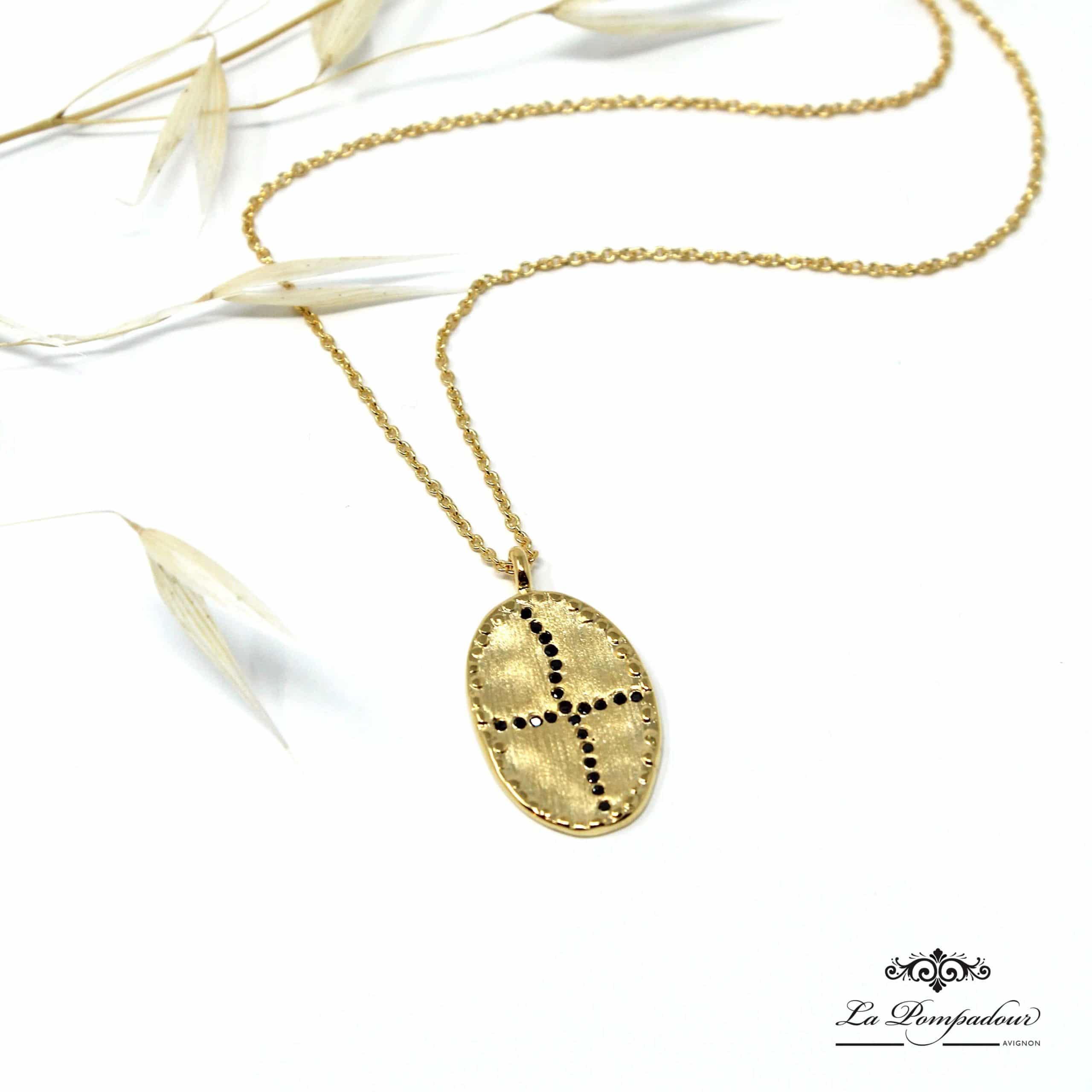 Collier croix irrégulière en plaqué or 3mc, matte et brossé, zircons noirs sertis. Longueur 48 cm