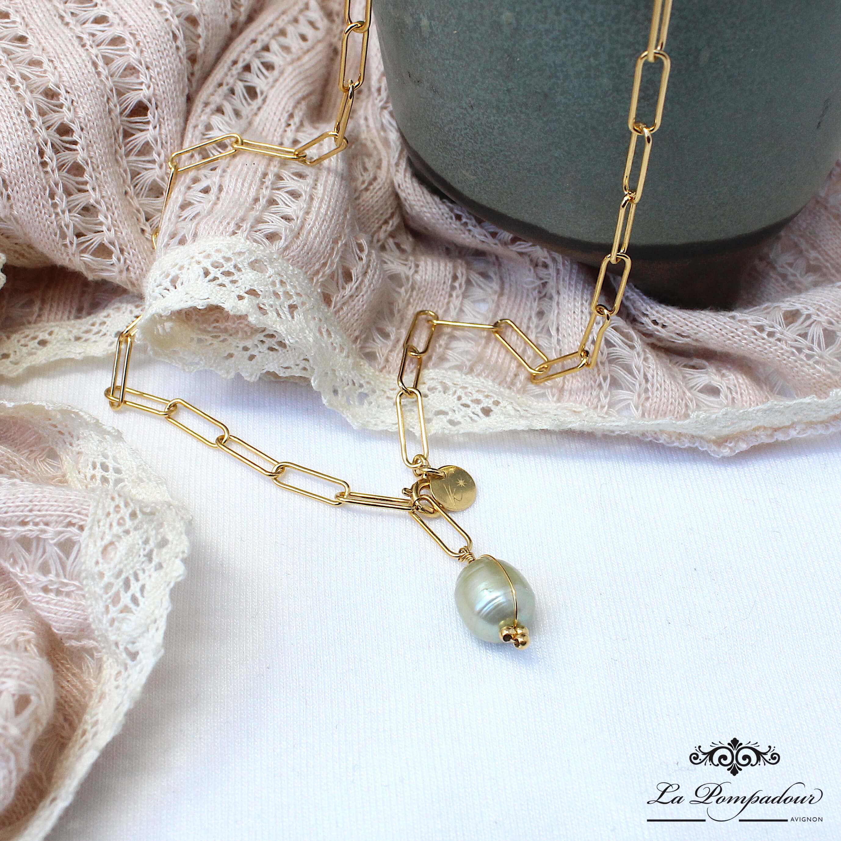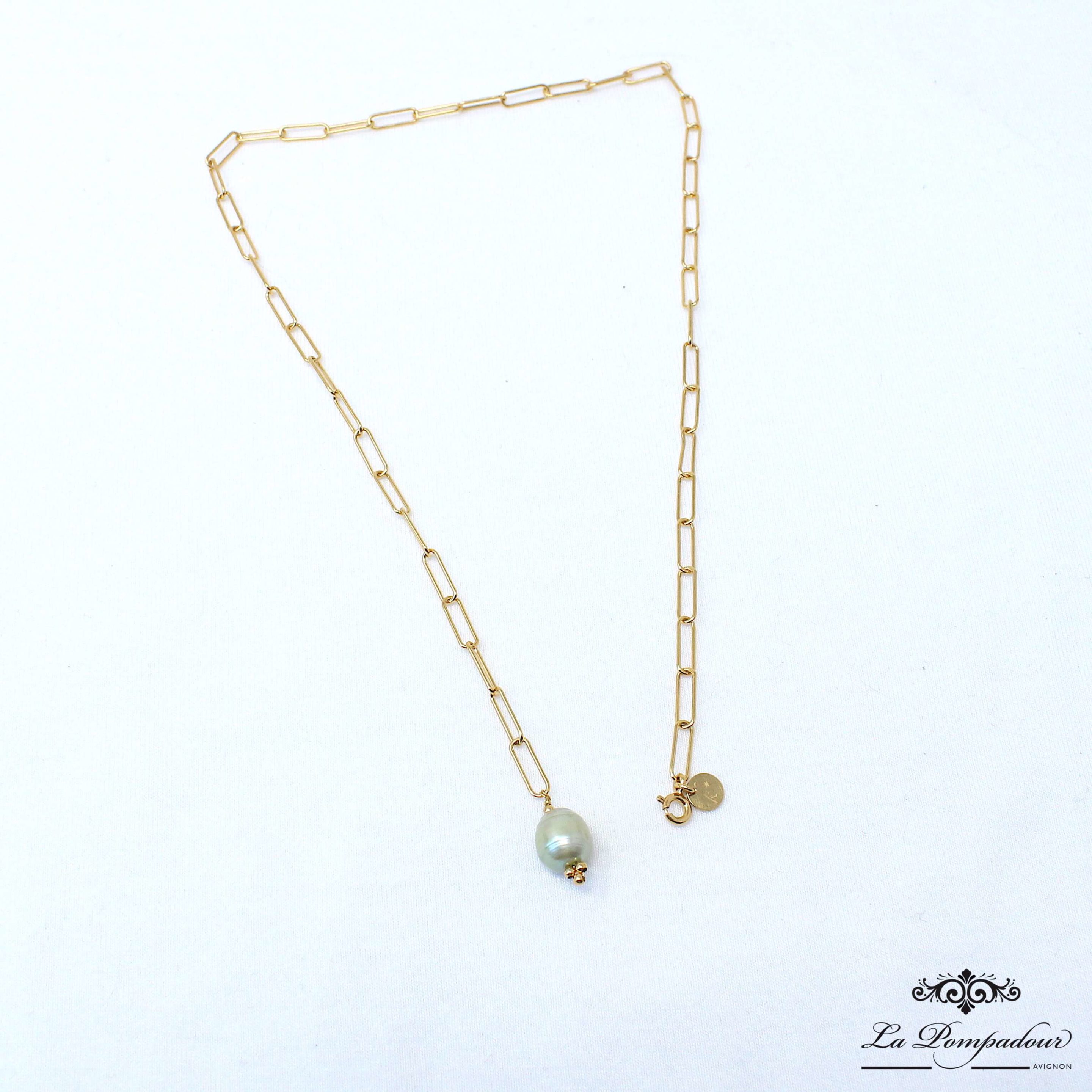 Collier chaine rectangle et perle d'eau douce d'une jolie couleur vert tendre. Fermoir mousqueton sur le devant. Vermeil