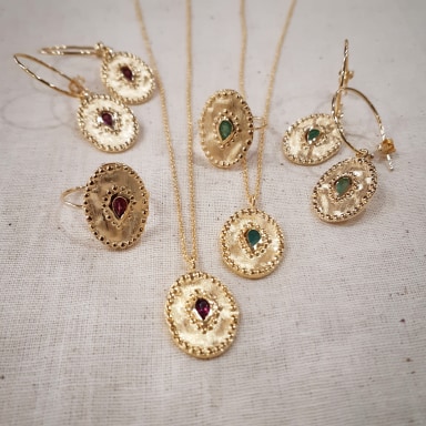 Collier en plaqué or 3mc, ovales mattes et brossées, rhodolite goutte sertie.