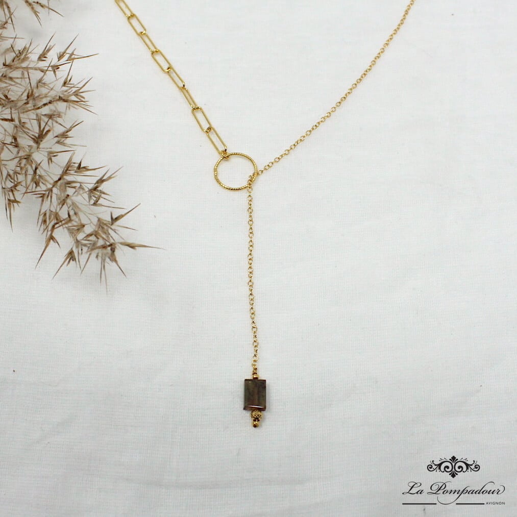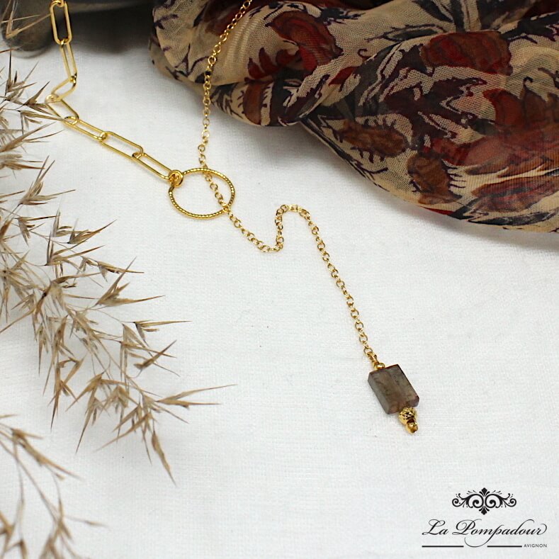 Elégant collier composé d'une chaine forçat et d'une chaine rectangle en vermeil, d'une andosolite rectangle qui passe dans un anneau