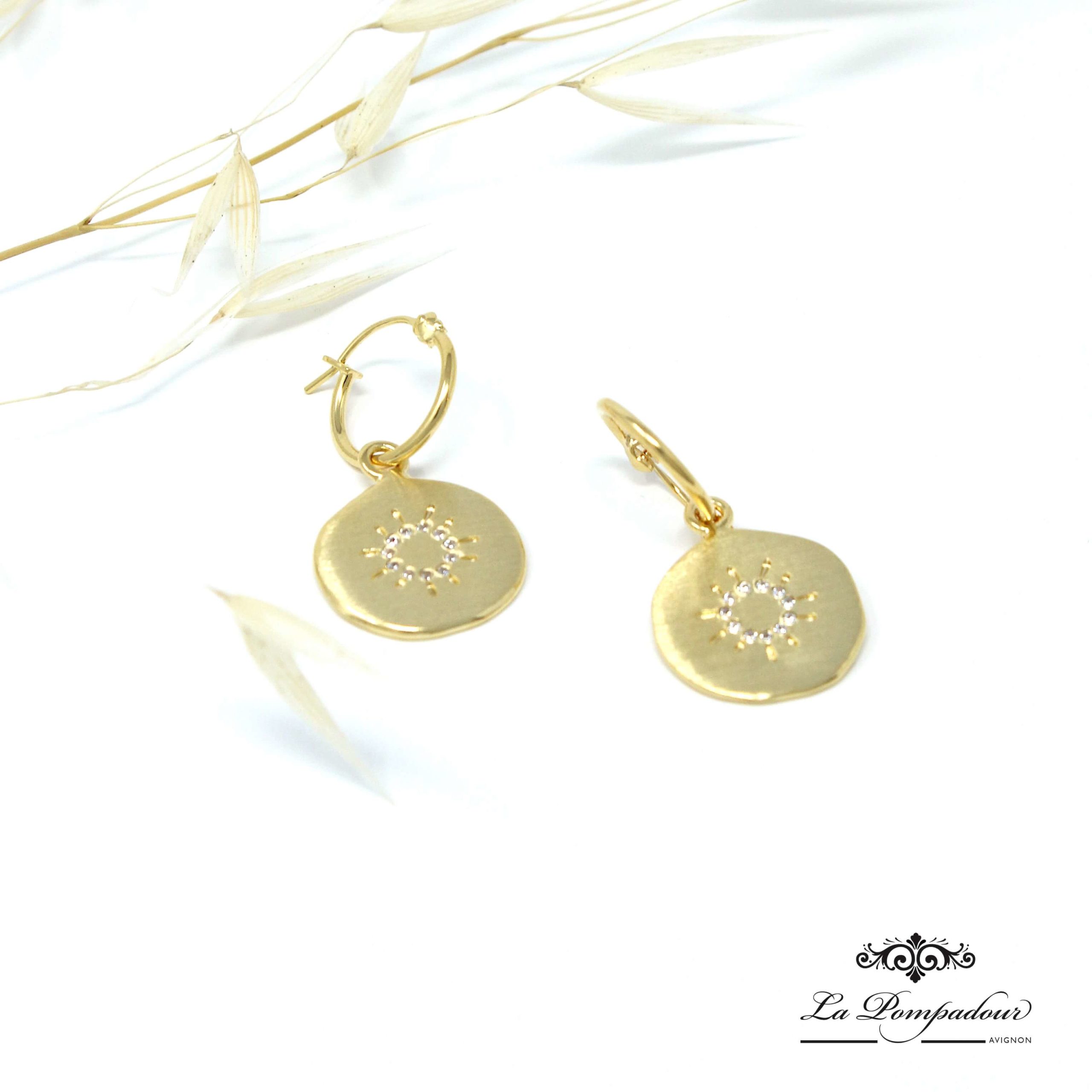 Créoles 1 cm de diamètre avec médaille mate, striée et pavée d’un soleil en zircons en plaqué or 3 microns