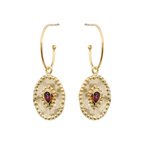 Créoles en plaqué or 3mc ovales mattes et brossées, rhodolite goutte sertie