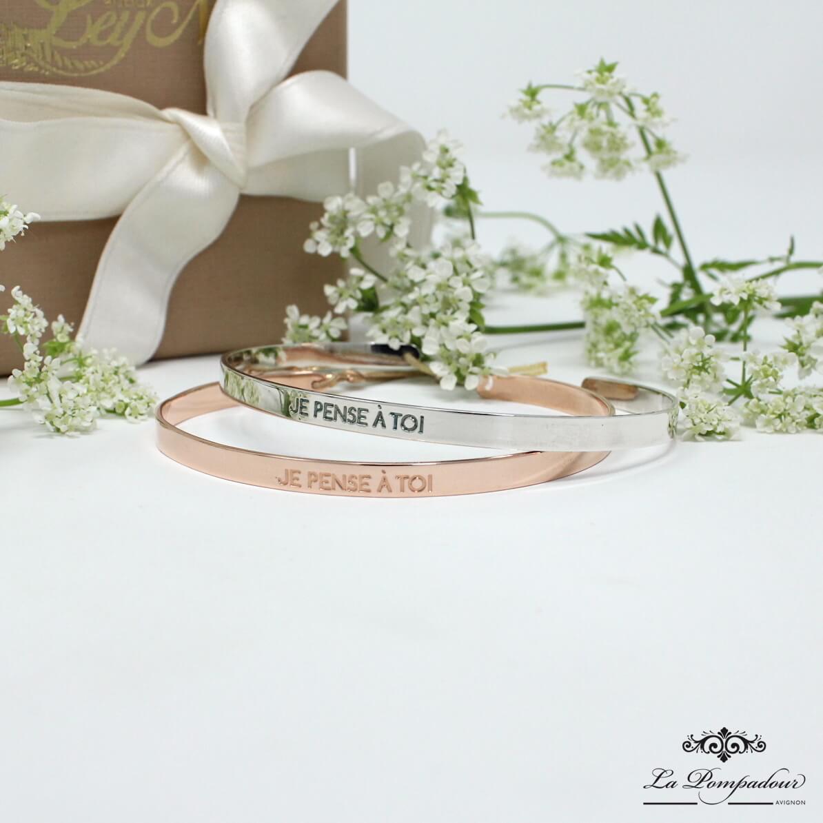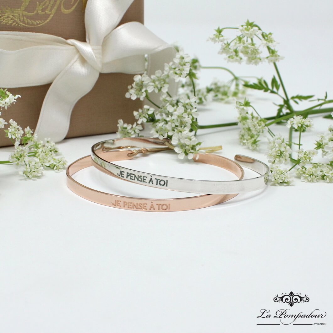 Elégant et intemporel jonc gravé “Je pense à toi”. Ajustable à tous les poignets