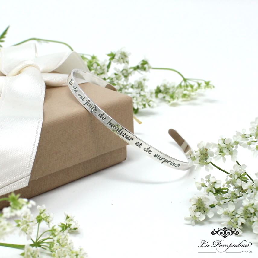 Elégant et intemporel jonc gravé police manuscrite “La vie est faite de bonheur et de surprises”. Ajustable à tous les poignets
