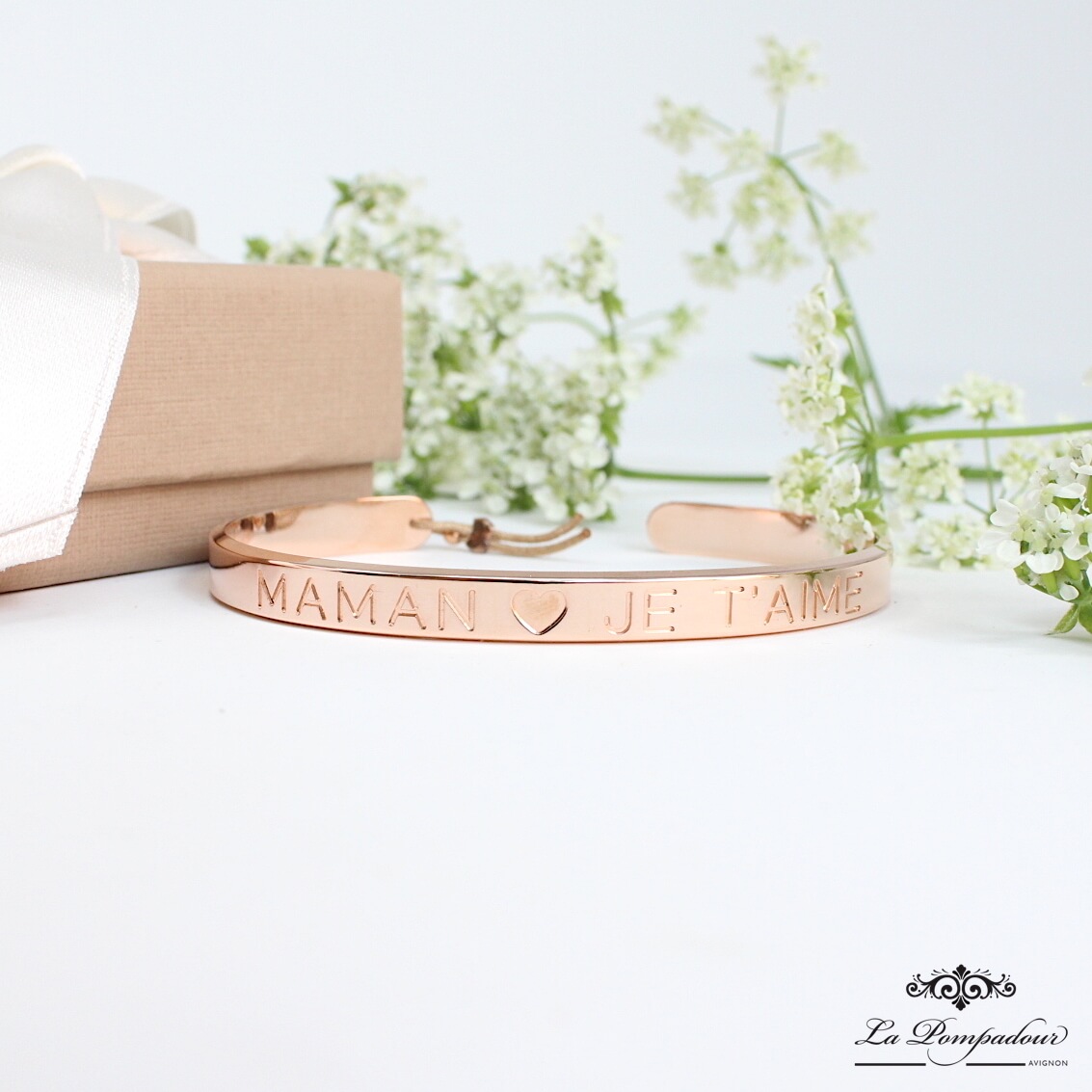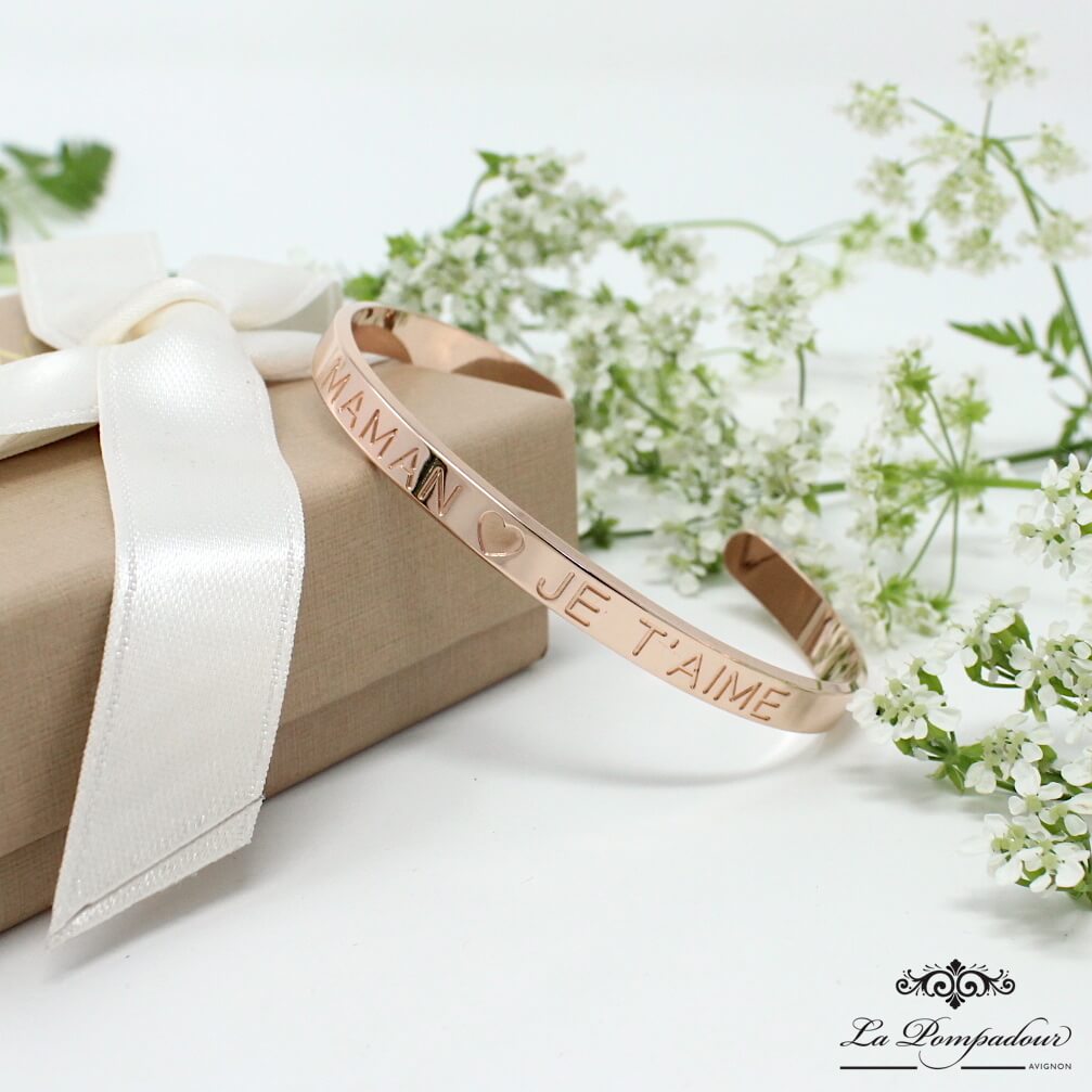 Elégant et intemporel jonc gravé “Maman je t’aime”. Ajustable à tous les poignets