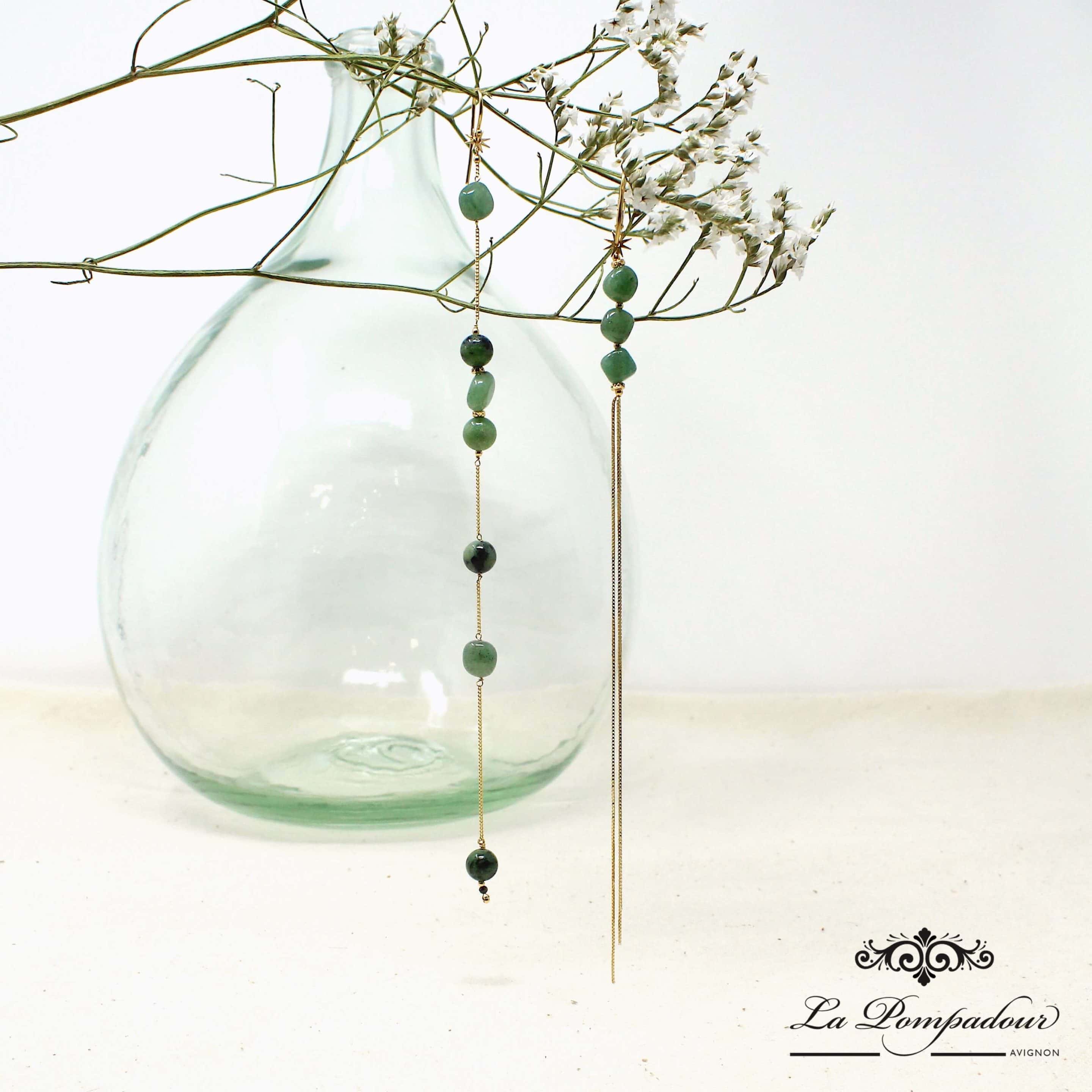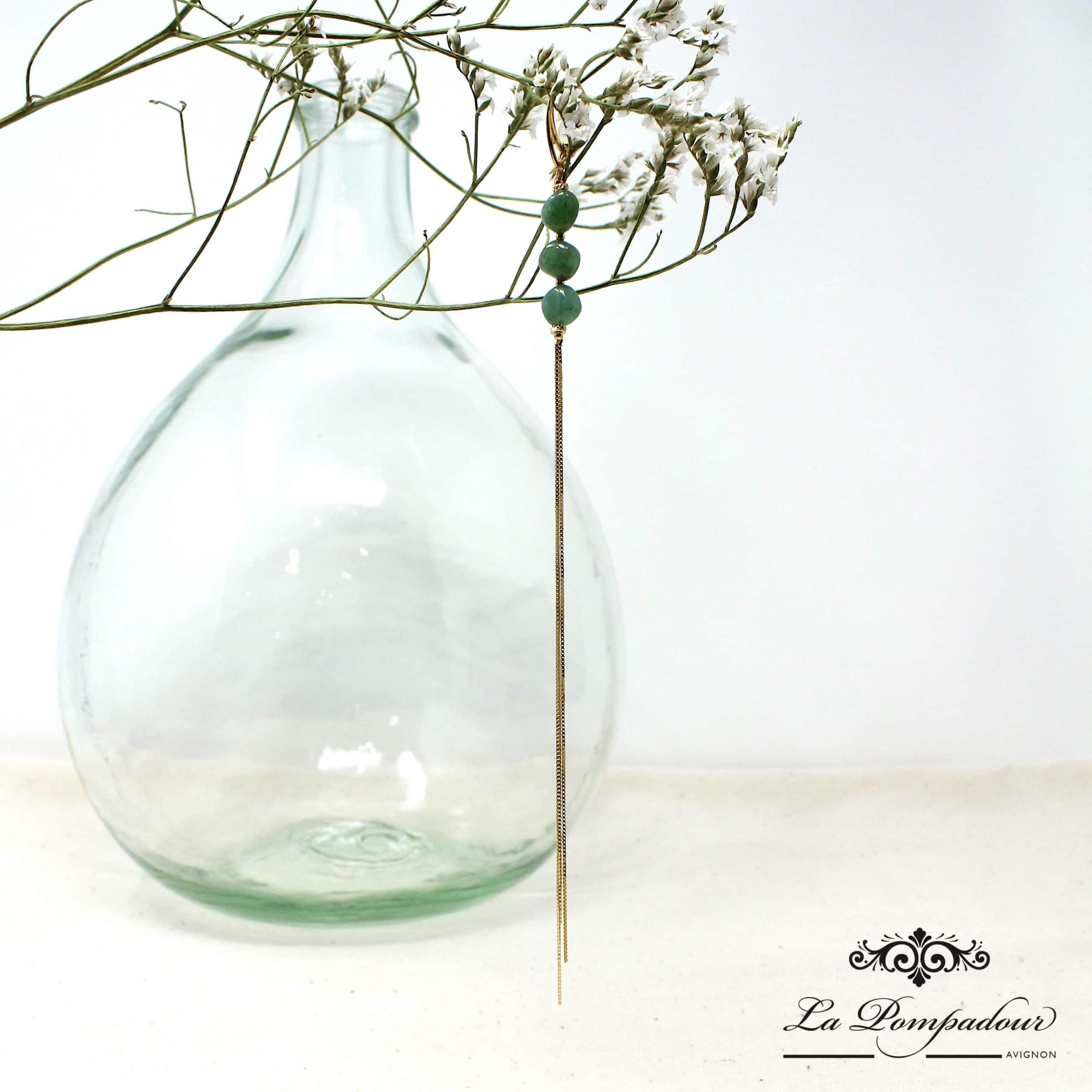 Longue Boucle d'oreille "mono boucle" composée de 3 perles Agate émeraude et de 3 chaines. Vermeil.