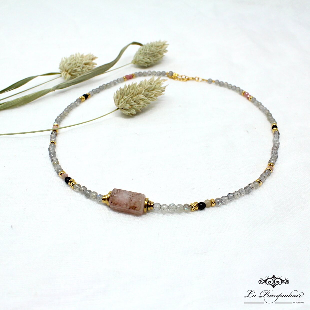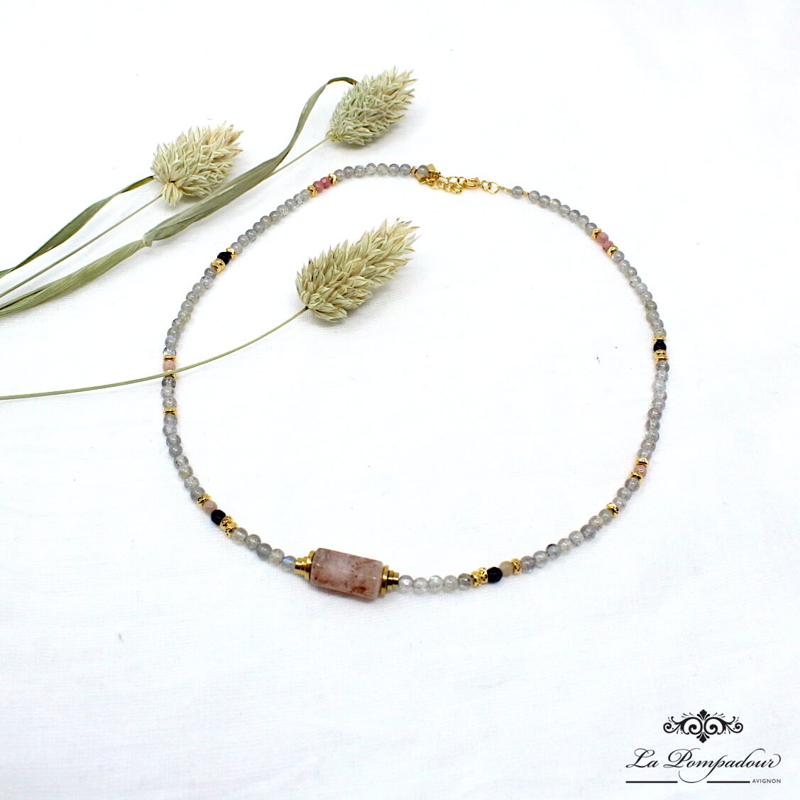 Collier ras du cou composé de perles de labradorite, rhodonite et beyrl, rondelles et perles de vermeil.
